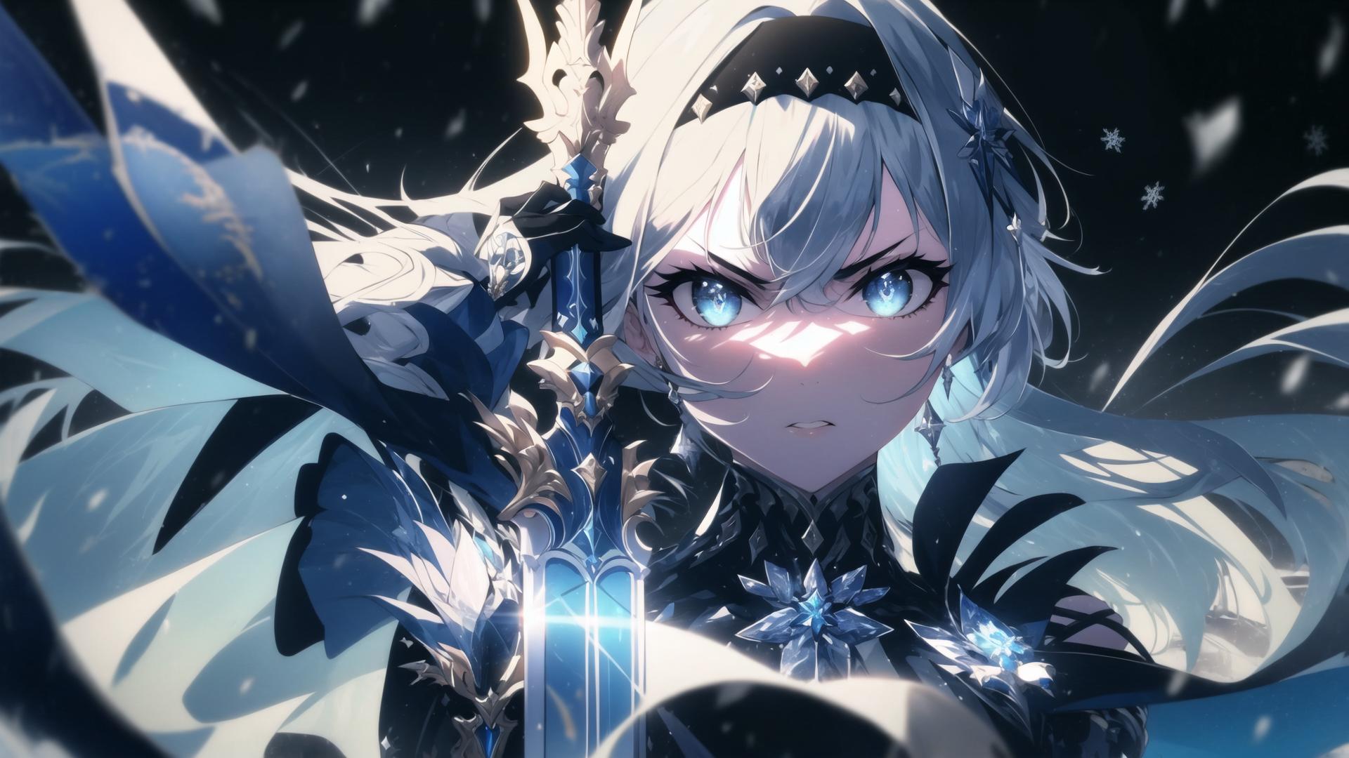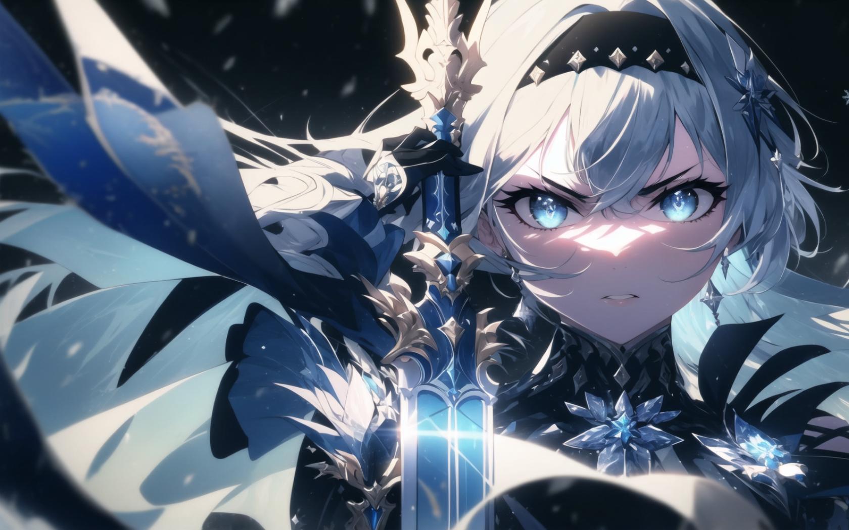 | Prompt | <lora:beautiful-eyes:1> (heroic,epic:1.5), perfect artwork, best quality,dynamic pose,sharp focus,(8k), (4k),(Masterpiece), (Best Quality), fantasy, extremely detailed, intricate, hyper detailed, (perfect face), illustration,soft lighting,(specular lighting:1.4), Ultra detailed fantasy environment, clearly worked out detail, intricate, cinematic,(depth of field), <lora:eula2:1>euladef,blue warpaints, night, moonrays, wind,dark fantasy art, angry, looking at viewer, golden ornate sword,((holding sword)),hand,white and black glove,gold, snowstorm background, snow, snowflakes, iceshards,, 1girl, bangs, blue eyes, blue flower, blurry, blurry background, depth of field, eyebrows visible through hair, floating hair, glint, hair between eyes, hairband, holding, holding sword, holding weapon, light particles, long hair, looking at viewer, silver hair, snowflakes, solo, sword, weapon |