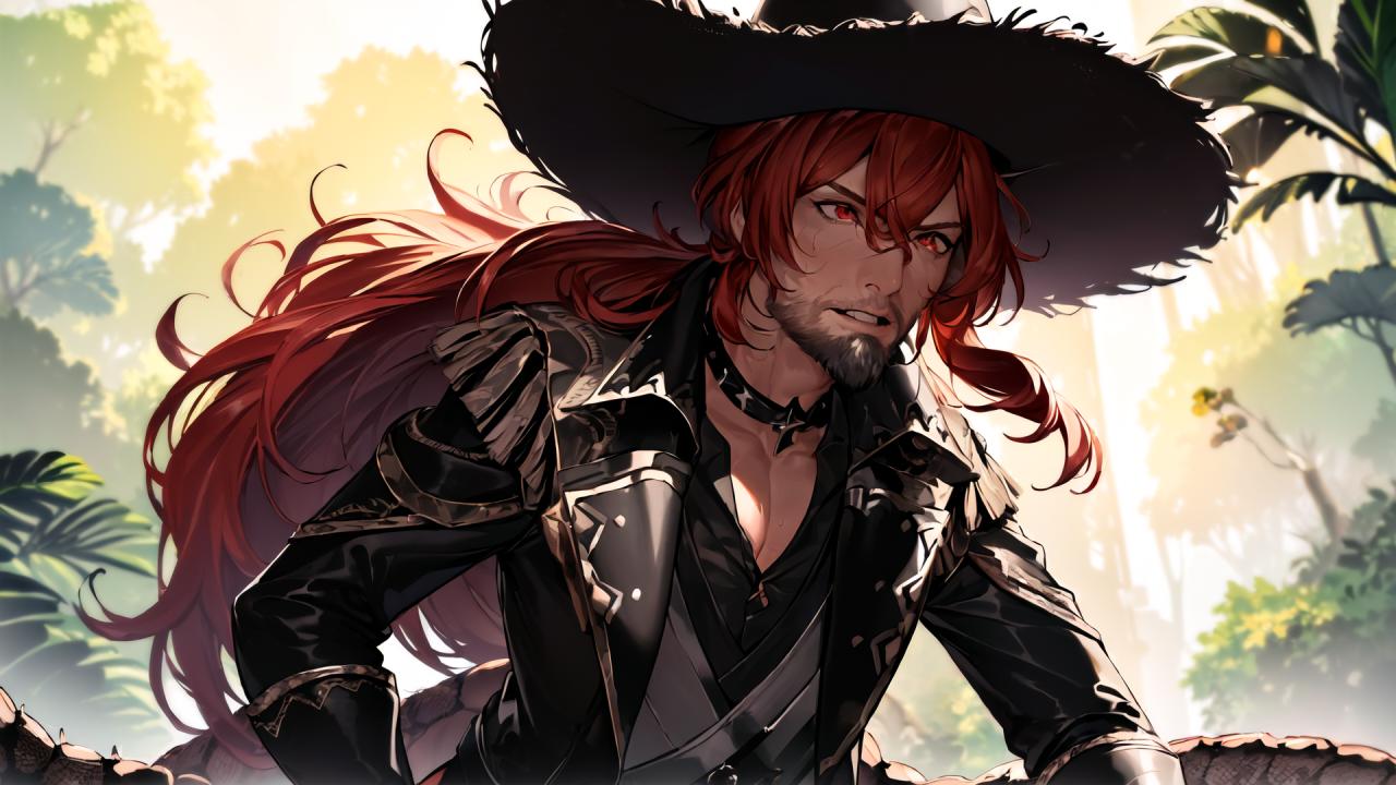 | Prompt | (highly detailed:1.5), (realistic:1.05),(digital art:1.7),,(romantic:1.4, heroic:1.7), (epic:1.5, perfect artwork), best quality,dynamic pose,sharp focus,(8k), (4k),(Masterpiece), (Best Quality), fantasy, extremely detailed, intricate, hyper detailed, (perfect face), illustration,soft lighting, Ultra detailed fantasy environment, clearly worked out detail, intricate, cinematic,(depth of field), ( dramatic lighting:1.1), <lora:Diluc_hardpruned:1>,diluc \(genshin impact\),, gloves, 1boy, bird, red eyes, red hair, male focus, black pants, belt, shirt, pants, vision (genshin impact), black gloves, long sleeves, hair between eyes, bangs, adjusting gloves, closed mouth, jacket, coat, solo, grey shirt, black coat, long hair, black shirt, collared shirt, black belt, open clothes, cropped legs, antenna hair, black jacket, two-tone gloves, belt buckle, ((muscular), day, sunny day, (hot), (sweat), outdoors, (indiana jones), (badass torn old black leather cowboy hat:1.3), (three days red beard:1.2), (liana, luxurious jungle background:1.5),waterfall, ( fighting against detailed giant snakes with black sword:1.6), smile, teeth, proud, confident, |