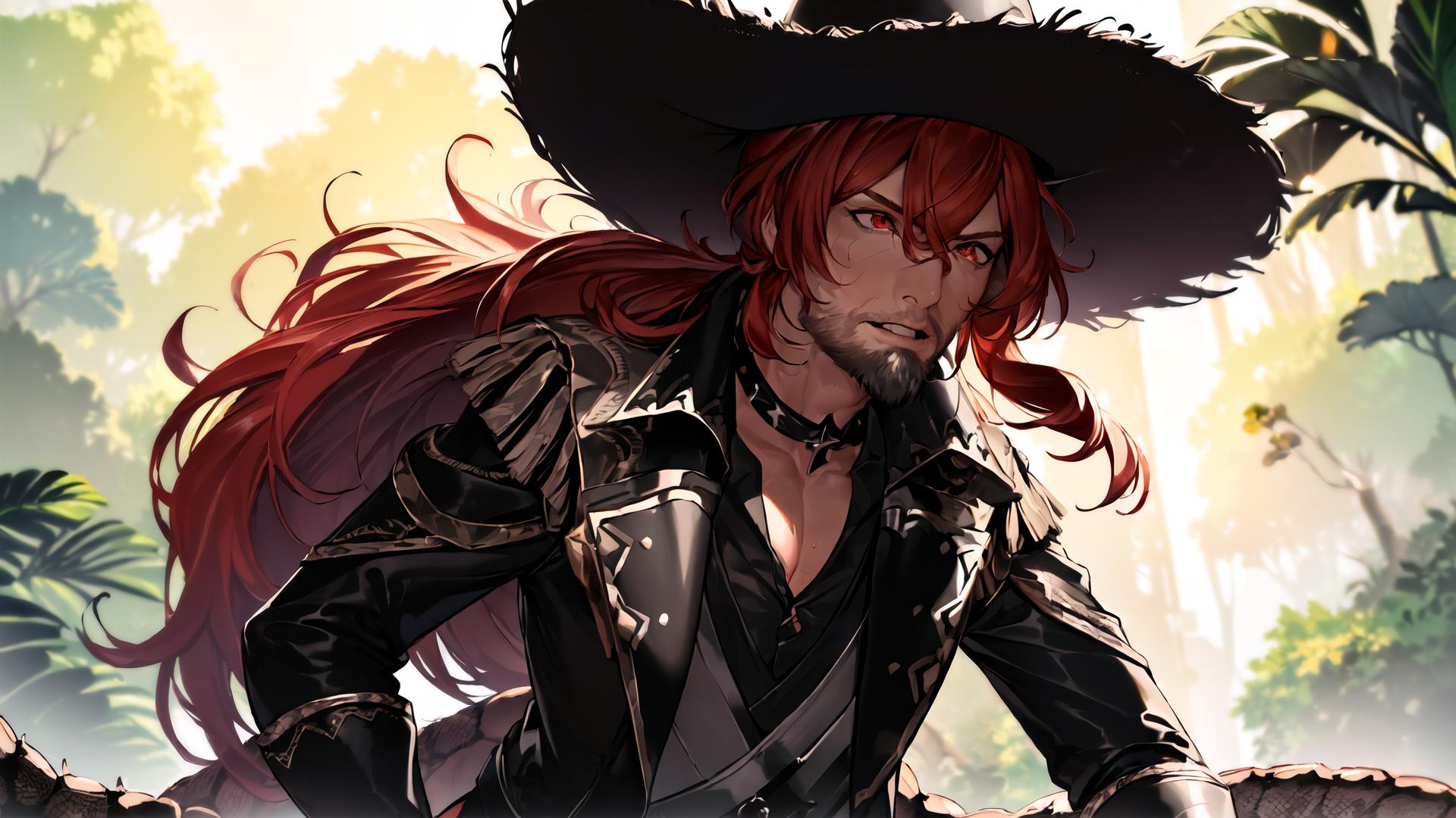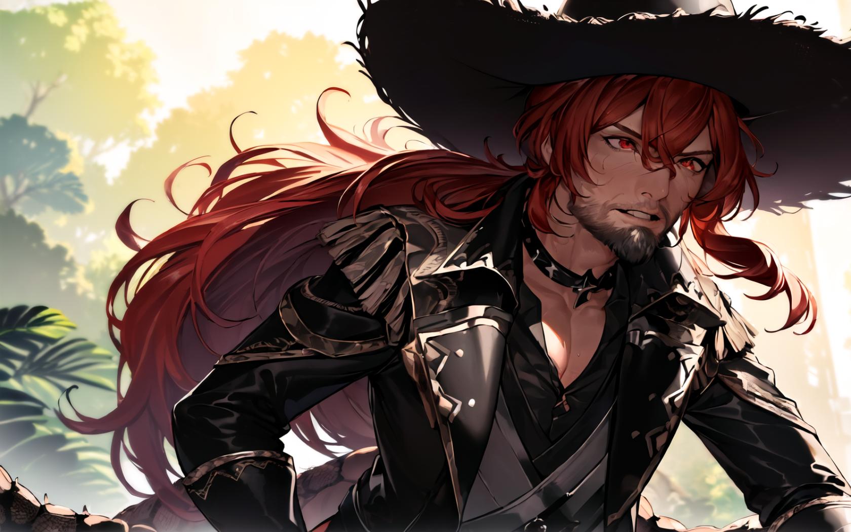 1boy, backlighting, bangs, beard, black choker, black gloves, black jacket, black shirt, choker, clenched teeth, collarbone, collared shirt, facial hair, gloves, hair between eyes, hat, jacket, lapels , leather, long hair, long sleeves, male focus, open clothes, open jacket, outdoors, parted lips, pectoral cleavage, ponytail, red eyes, red hair, shirt, solo, tree, upper body, vest