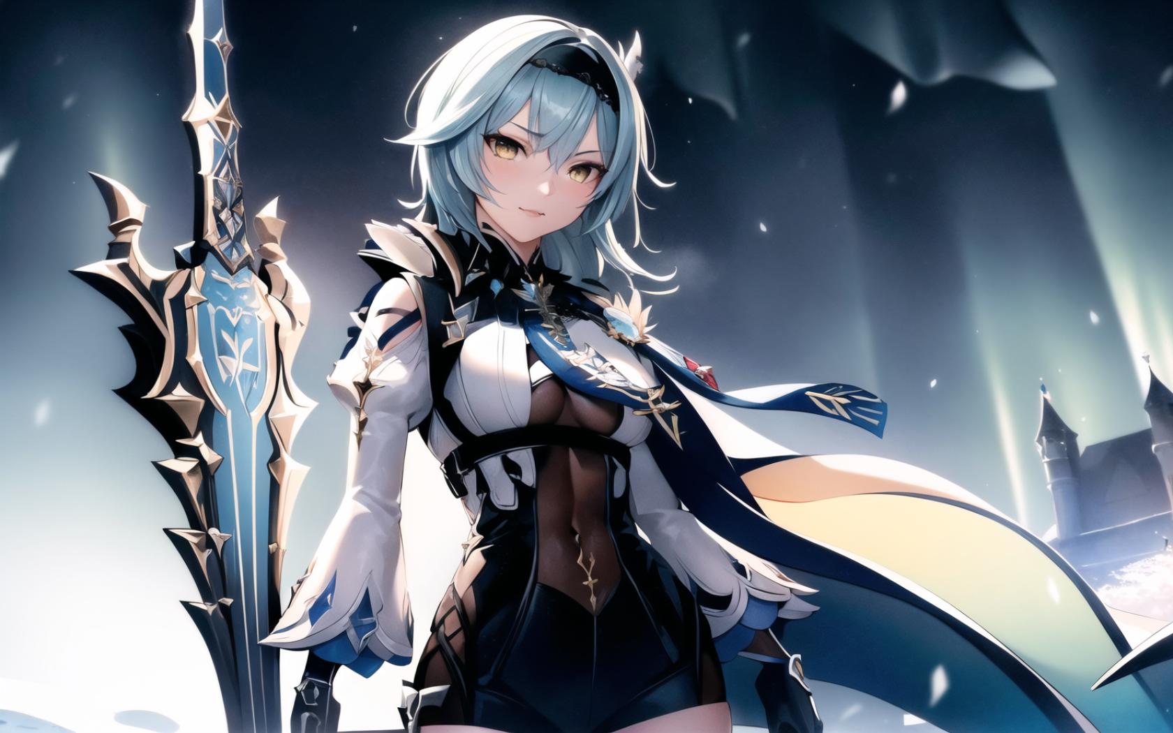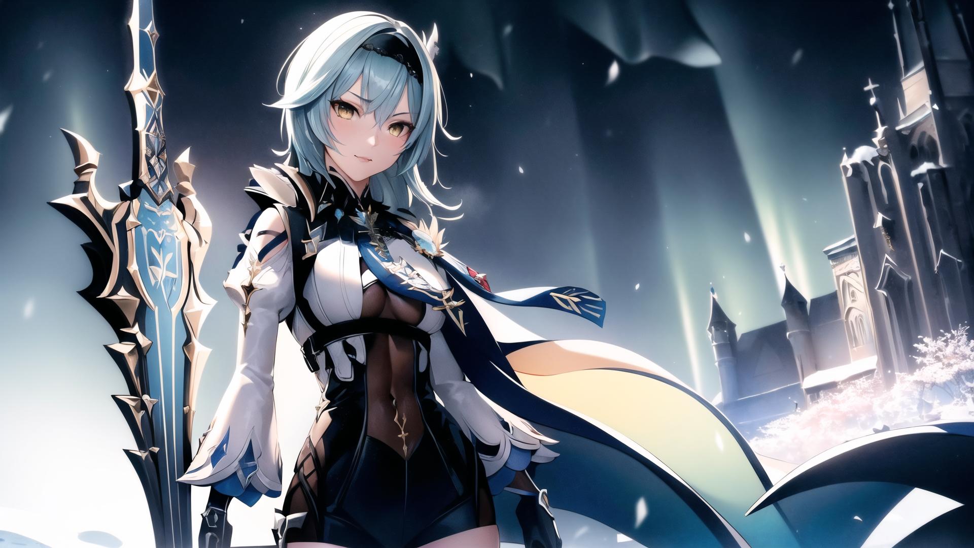| Prompt | (style of Greg Rutkowski:1.6), (style of Russ Mills:1.8), (style of style of Will Murai:1.5), (highly detailed:1.5), (epic:1.5, perfect artwork), best quality,dynamic pose,sharp focus,(8k), (4k),(Masterpiece), (Best Quality), fantasy, extremely detailed, intricate, hyper detailed, (perfect face), illustration,soft lighting, Ultra detailed fantasy environment, clearly worked out detail, intricate, cinematic,(depth of field), ( dramatic lighting:1.2), <lora:eula2:1>, euladef, 1 girl,large breasts, night, moonlit, (snow:1.2), (snowflakes), (galaxy background, aurora borealis:1.2), snow trees, outdoors, wind, white petals in the wind, (white medieval cathedral background:1.2,inside a rich garden courtyard, white flowers, bush of flowers), (holding weapon:1.3), hand on hip, looking at viewer, light smile, sexy, (standing upright), |