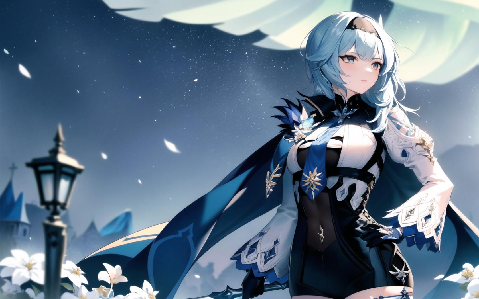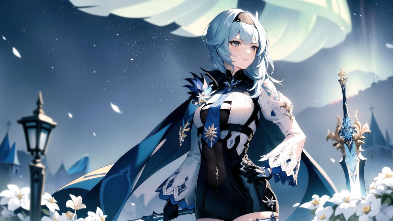 Prompt (style of Jorge Jacinto:1.9, style of Stephen Hickman:1.5, style of John Blanche:1.5, style of Russ Mills:1.4), (highly detailed:1.5), (epic:1.5, perfect artwork), best quality,dynamic pose,sharp focus,(8k), (4k),(Masterpiece), (Best Quality), fantasy, extremely detailed, intricate, hyper detailed, (perfect face), illustration,soft lighting, Ultra detailed fantasy environment, clearly worked out detail, intricate, cinematic,(depth of field), ( dramatic lighting:1.2), <lora:eula2:1>, euladef, 1 girl,large breasts, night, moonlit, (snow:1.2), (snowflakes), (galaxy background, aurora borealis:1.2), snow trees, outdoors, wind, white petals in the wind, (white medieval cathedral background:1.2,inside a rich garden courtyard, white flowers, bush of flowers), (holding weapon:1.3), hand on hip, looking at viewer, light smile, sexy, (standing upright),