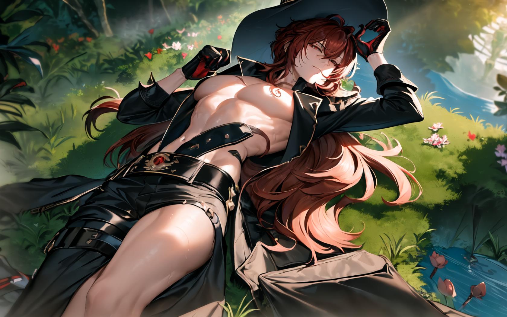 1boy, abs, antenna hair, arm up, bangs, belt, bird, black belt, black coat, black gloves, black jacket, black pants, black shirt, closed mouth, coat, day, flower, gloves, grass, hair between eyes, hat, holding, jacket, long hair, long sleeves, lying, male focus, navel, on back, open clothes, open coat, open jacket, open shirt, outdoors, pants, pectorals, ponytail, red eyes, red gloves, red hair, shirt, sidelocks, smile, solo, solo focus, thigh strap, toned, tree, two-tone gloves , vision (genshin impact)