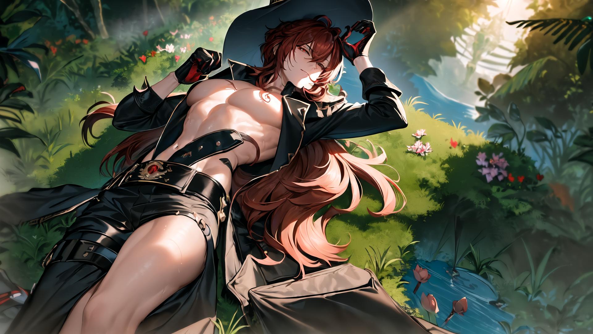 | Prompt | (highly detailed:1.5), (realistic:1.05),(digital art:1.7),,(romantic:1.4, heroic:1.7), (epic:1.5, perfect artwork), best quality,dynamic pose,sharp focus,(8k), (4k),(Masterpiece), (Best Quality), fantasy, extremely detailed, intricate, hyper detailed, (perfect face), illustration,soft lighting, Ultra detailed fantasy environment, clearly worked out detail, intricate, cinematic,(depth of field), ( dramatic lighting:1.1), <lora:Diluc_hardpruned:1>,diluc \(genshin impact\),, gloves, 1boy, bird, red eyes, red hair, male focus, black pants, belt, shirt, pants, vision (genshin impact), black gloves, long sleeves, hair between eyes, bangs, adjusting gloves, closed mouth, jacket, coat, solo, grey shirt, black coat, long hair, black shirt, collared shirt, black belt, open clothes, cropped legs, antenna hair, black jacket, two-tone gloves, belt buckle, ((muscular), (((topless))), day, sunny day, (hot), (sweat), outdoors, (indiana jones), (badass torn old black leather cowboy hat:1.3), (three days red beard:1.2), (liana, luxurious jungle background:1.5),waterfall, (lying on the back in jungle pond:1.6), smile, teeth, proud, confident, |