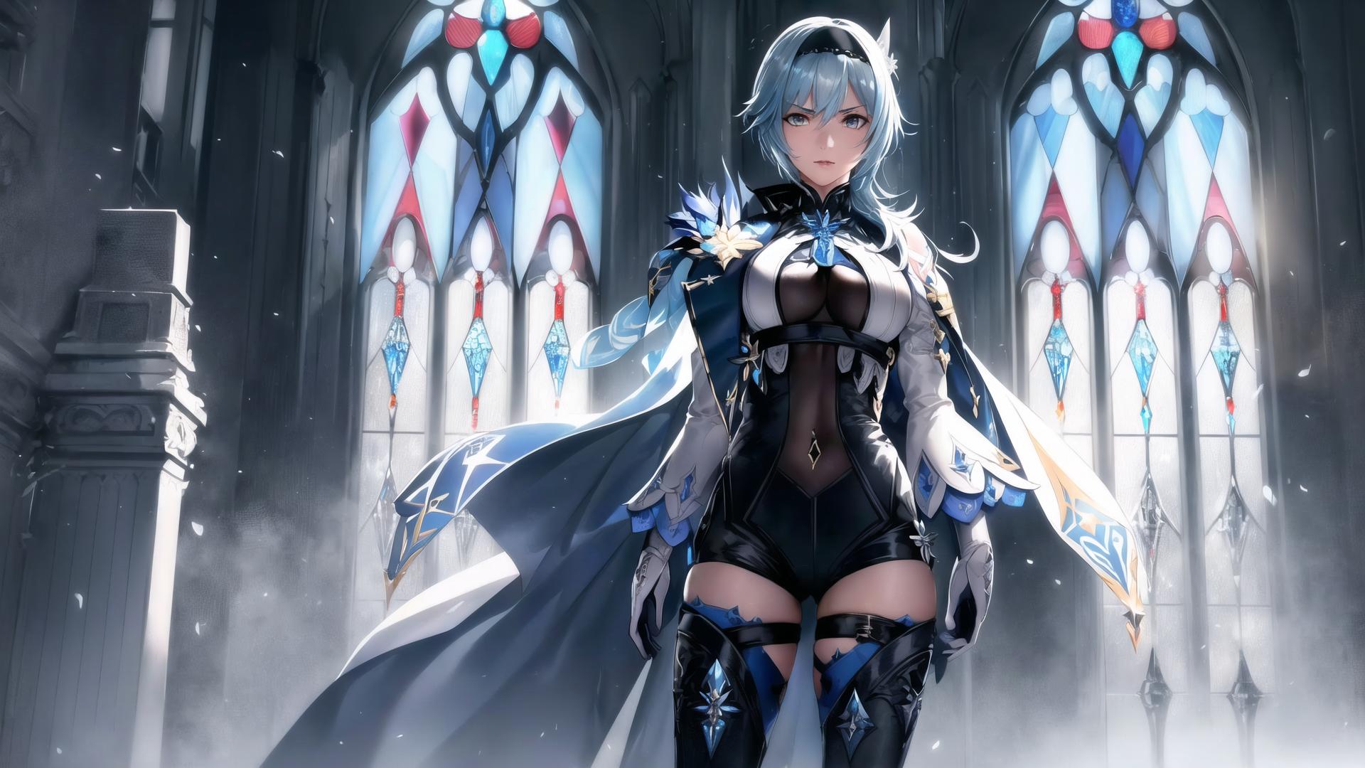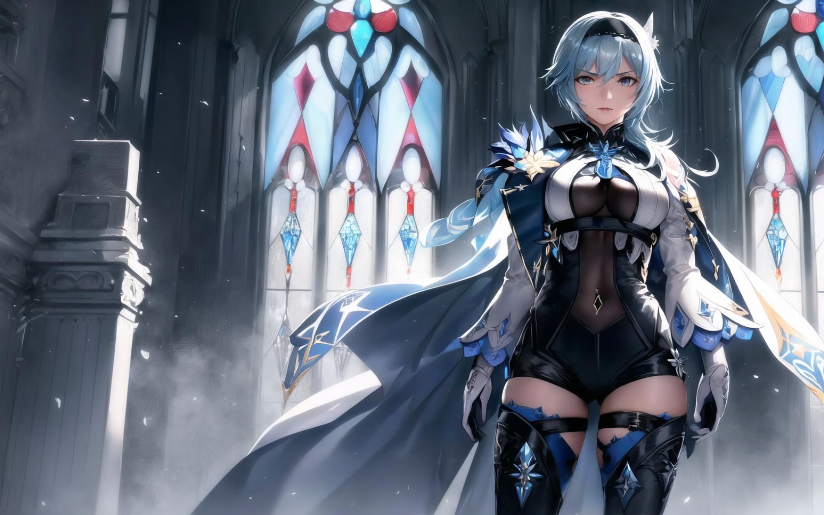 Prompt (style of Greg Rutkowski:1.5), (highly detailed:1.5), (romantic:1.4), (heroic:1.6), (realistic:1.2), (epic:1.5, perfect artwork), best quality,dynamic pose,sharp focus,(8k), (4k),(Masterpiece), (Best Quality), fantasy, extremely detailed, intricate, hyper detailed, (perfect face), illustration,soft lighting, Ultra detailed fantasy environment, clearly worked out detail, intricate, cinematic,(depth of field), ( dramatic lighting:1.7), <lora:eula2:1>, euladef,(medium breasts:1.2), (light blue hair), (1girl, solo:1.3), (short hair:1.5), short light blue hair, (blue and white ornate cape:1.4), outdoors, snow, (snowflakes, wind), (snowstorm:1.3), sun, (Standing front a white cathedral with stained glass:1.5), (sunrays through stained glass:1.2), (raising sword :1.3), (slowly walking to viewer), serious, proud, looking at viewer,