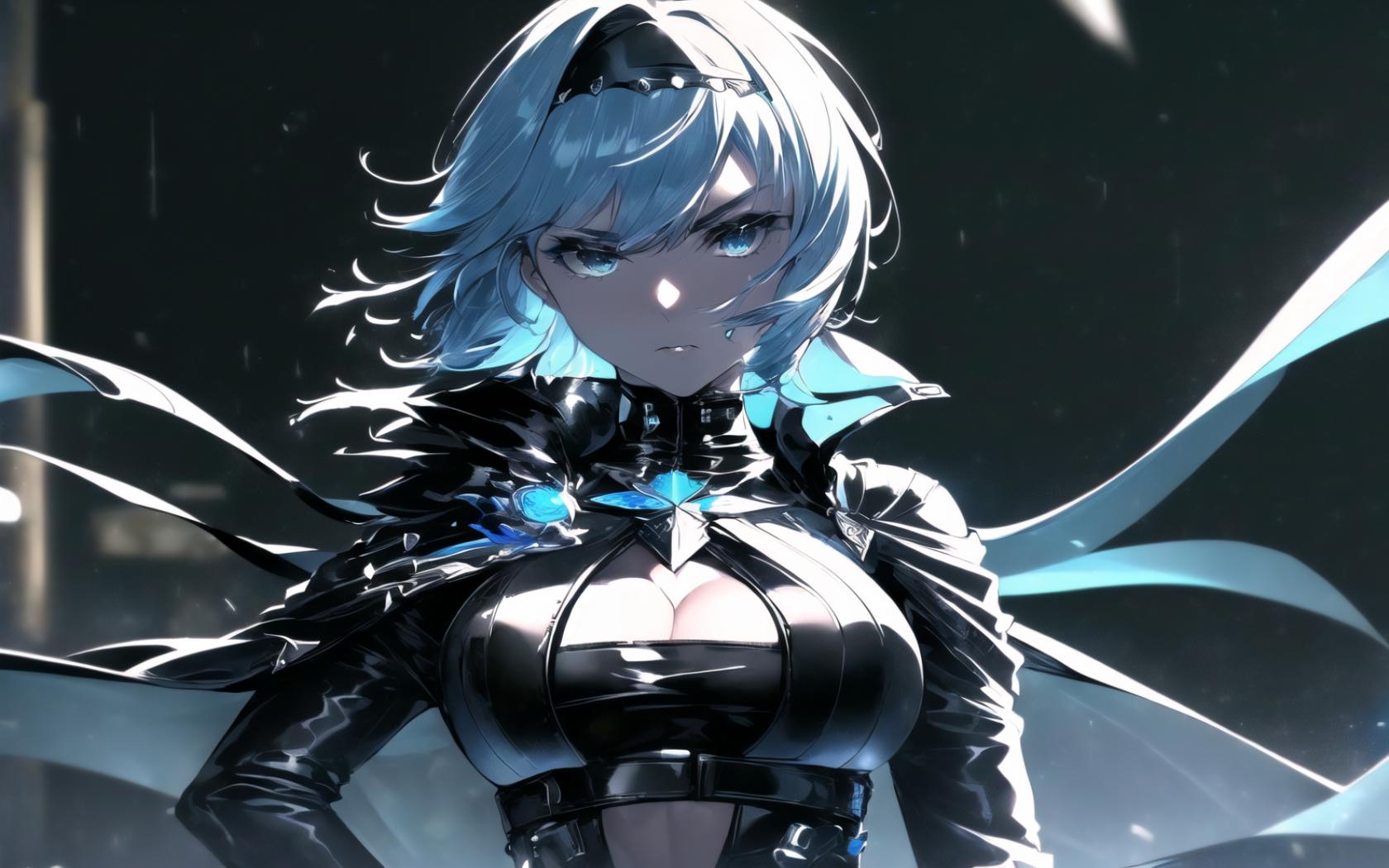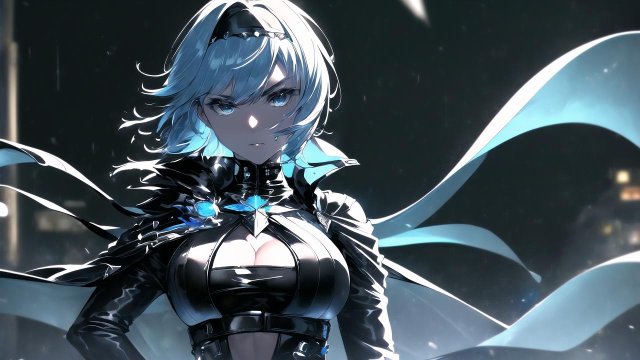 | Prompt | (highly detailed:1.5), (romantic:1.4), (heroic:1.6), (realistic:1.4), <lora:beautiful-eyes:1>, (epic:1.5, perfect artwork), best quality,dynamic pose,sharp focus,(8k), (4k),(Masterpiece), (Best Quality), fantasy, extremely detailed, intricate, hyper detailed, (perfect face), illustration,soft lighting, Ultra detailed fantasy environment, clearly worked out detail, intricate, cinematic,(depth of field:1.4), ( futuristic town at night, galaxy background:1.2), night, moon, moonlit,dramatic lighting, <lora:eula2:0.9>, eularnd,large breasts, (light blue hair:1.6), (1girl, solo:1.3), ( short hair in the wind:1.5), short light blue hair, (mature:1.3), (motherly), (gradient eyes:1.4), (rain, wind:1.1), mist, (sci-fi:1.9, manga art:1.2), (black and blue theme:1.1), (futuristic black leather cape:1.6), (futuristic black leather suit:1.6), (black chest lace:1.5), (standing upright), (left hand on hip:1.4), ((sexy)), angry, (looking at viewer:1.2), (headshot, closeup:1.3), |