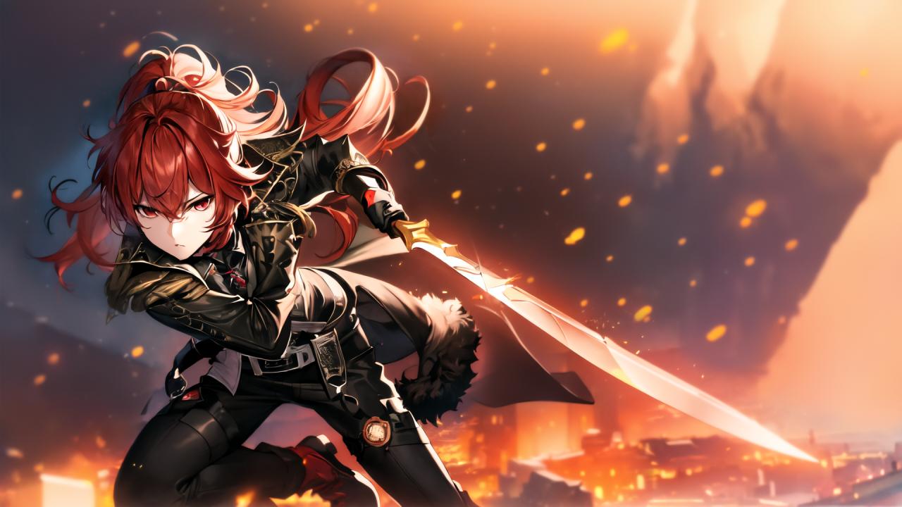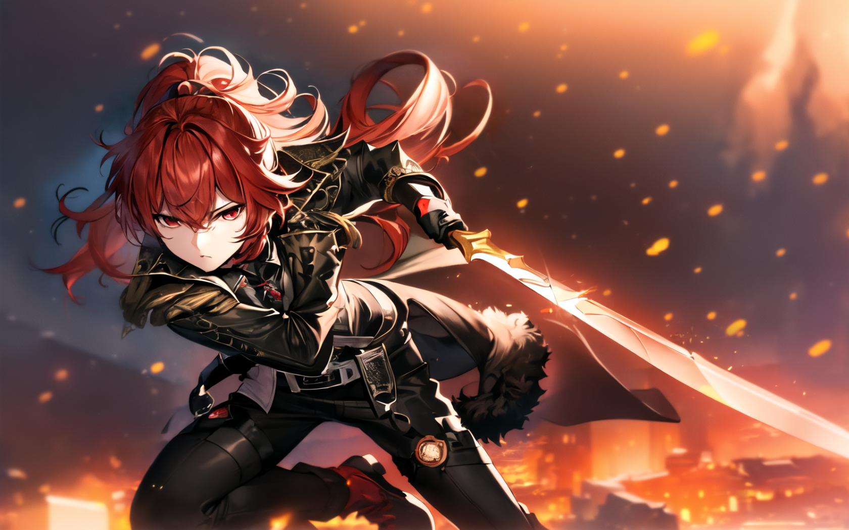 1boy, bangs, belt, black coat, black gloves, black jacket, black pants, boots, closed mouth, coat, embers , fire, fur trim, gloves, hair between eyes, holding, holding sword, holding weapon, jacket, long hair, long sleeves, looking at viewer, male focus, necktie, pants, ponytail, red eyes, red hair, serious, shirt, solo, sword, vision (genshin impact), weapon