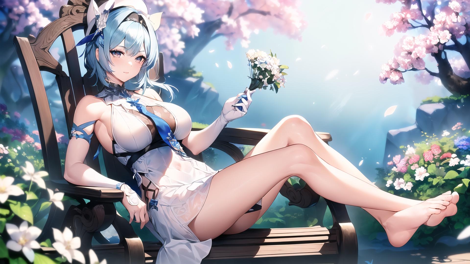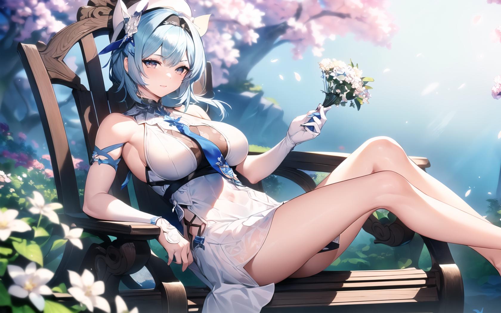 | Prompt | (highly detailed:1.1), (digital art:1.4), (romantic:1.4), (epic:1.4,perfect artwork), best quality,dynamic pose,sharp focus,(8k), (4k),(Masterpiece), (Best Quality), fantasy, extremely detailed, intricate, hyper detailed, (perfect face), illustration, clearly worked out detail, intricate, cinematic,(depth of field:1.2), <lora:eula2:1>, eularnd,large breasts, (light blue hair), ( short blue hair:1.1), short light blue hair, (marron and blue eyes), (1girl, solo:1.4), outdoors, spring, butterflies, (rich medieval garden background, bushes of flowers, white marble statues, trees), (white flower in the air, bracers of white flower, ankle bracers of blue flowers;1.2), (white hat with flowers tied, white lace dress, white chestlace, bare feet, bare shoulders, bare hands, bare arms:1.5), (lying in a rocking chair:1.3), hot, (using a white fan:1.2), sexy, smile, looking at viewer, |
