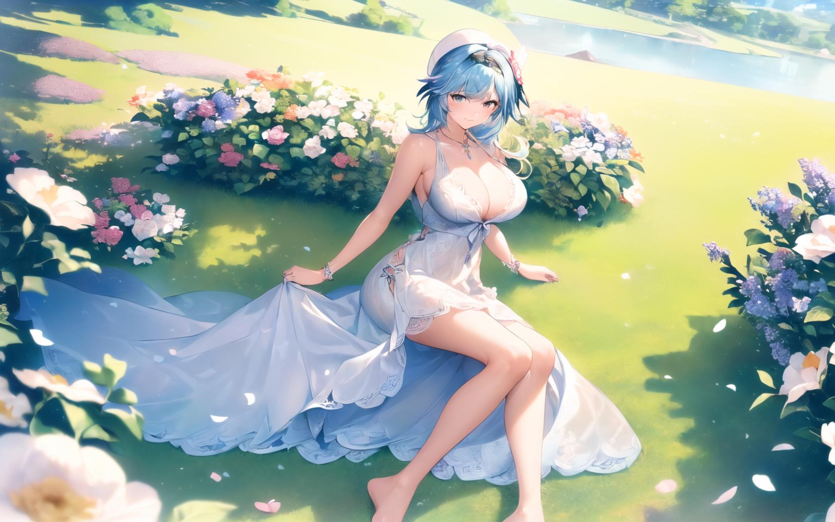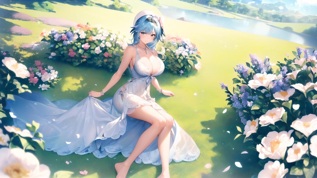 | Prompt | (highly detailed:1.1), (digital art:1.4), (romantic:1.4), (style of John Blanche:1.9), (epic:1.4,perfect artwork), best quality,dynamic pose,sharp focus,(8k), (4k),(Masterpiece), (Best Quality), fantasy, extremely detailed, intricate, hyper detailed, (perfect face), illustration, clearly worked out detail, intricate, cinematic,(depth of field:1.2), <lora:eula2:1>, eularnd,large breasts, (light blue hair), ( short blue hair:1.1), short light blue hair, (marron and blue eyes), (1girl, solo:1.4), outdoors, spring, butterflies, (rich medieval garden background, bushes of flowers, white marble statues, trees), (white flower in the air, bracers of white flower, ankle bracers of blue flowers;1.2), (white hat with flowers tied, white lace dress, white chestlace, bare feet, bare shoulders, bare hands, bare arms:1.5), (lying in a rocking chair:1.3), hot, (using a white fan:1.2), sexy, smile, shy, blush, looking at viewer, |