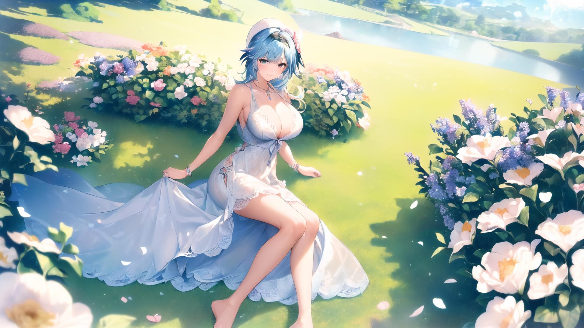 1girl, alternate costume, bangs, bare arms, bare legs, bare shoulders, barefoot, black hairband, blue hair, bracelet, cleavage, closed mouth, day, dress, field , flower, grass, hair ornament, hairband, hat, jewelry, large breasts, legs, looking at viewer, medium hair, necklace, outdoors, sitting, sleeveless, sleeveless dress, smile, solo, white dress, white headwear