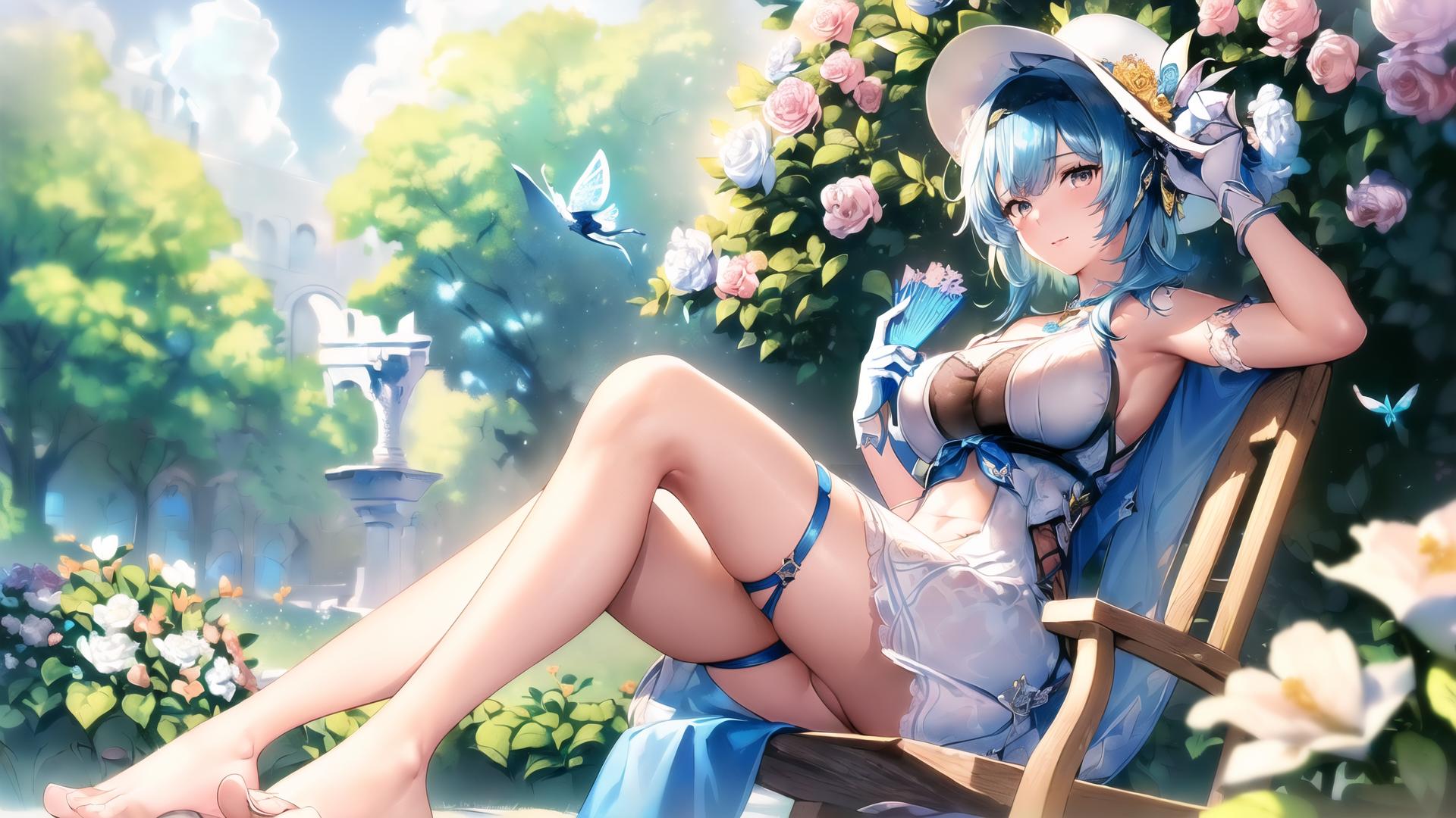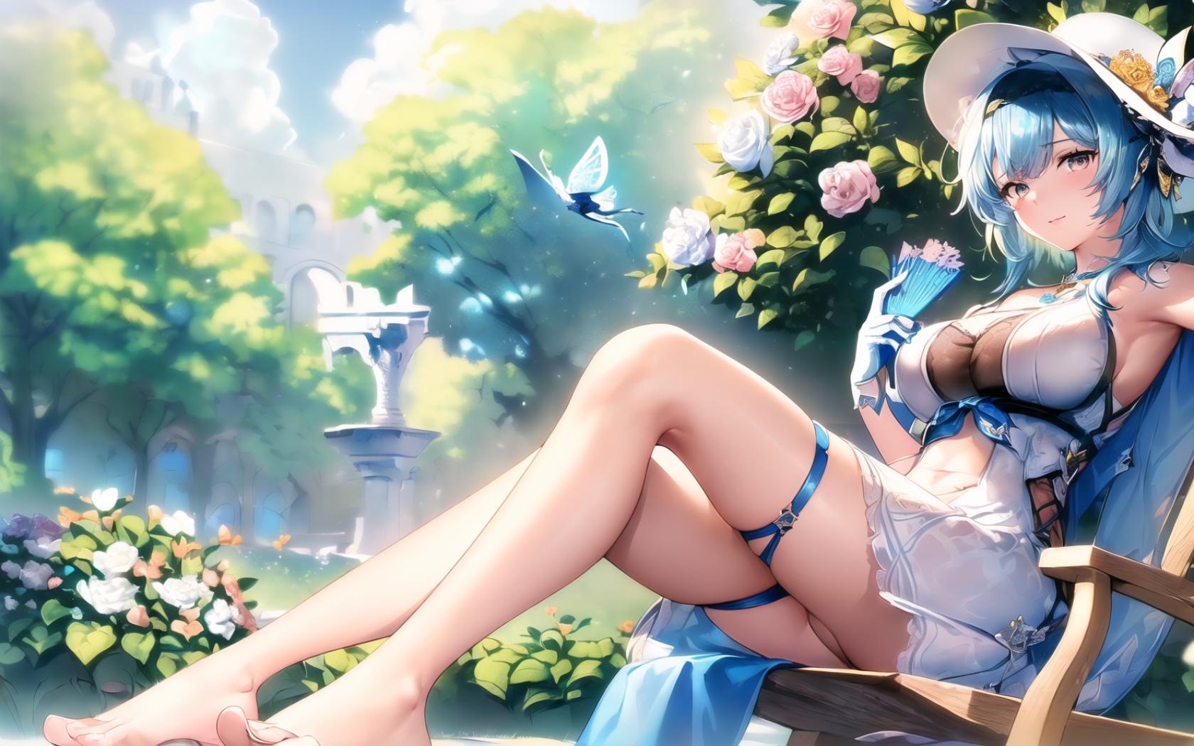 | Prompt | (highly detailed:1.1), (digital art:1.4), (romantic:1.4), (style of John Blanche:1.9), (epic:1.4,perfect artwork), best quality,dynamic pose,sharp focus,(8k), (4k),(Masterpiece), (Best Quality), fantasy, extremely detailed, intricate, hyper detailed, (perfect face), illustration, clearly worked out detail, intricate, cinematic,(depth of field:1.2), <lora:eula2:1>, eularnd,large breasts, (light blue hair), ( short blue hair:1.1), short light blue hair, (marron and blue eyes), (1girl, solo:1.4), outdoors, spring, butterflies, (rich medieval garden background, bushes of flowers, white marble statues, trees), (white flower in the air, bracers of white flower, ankle bracers of blue flowers;1.2), (white hat with flowers tied, white lace dress, white chestlace, bare feet, bare shoulders, bare hands, bare arms:1.5), (lying in a rocking chair:1.3), hot, (using a white fan:1.2), sexy, smile, shy, blush, looking at viewer, |