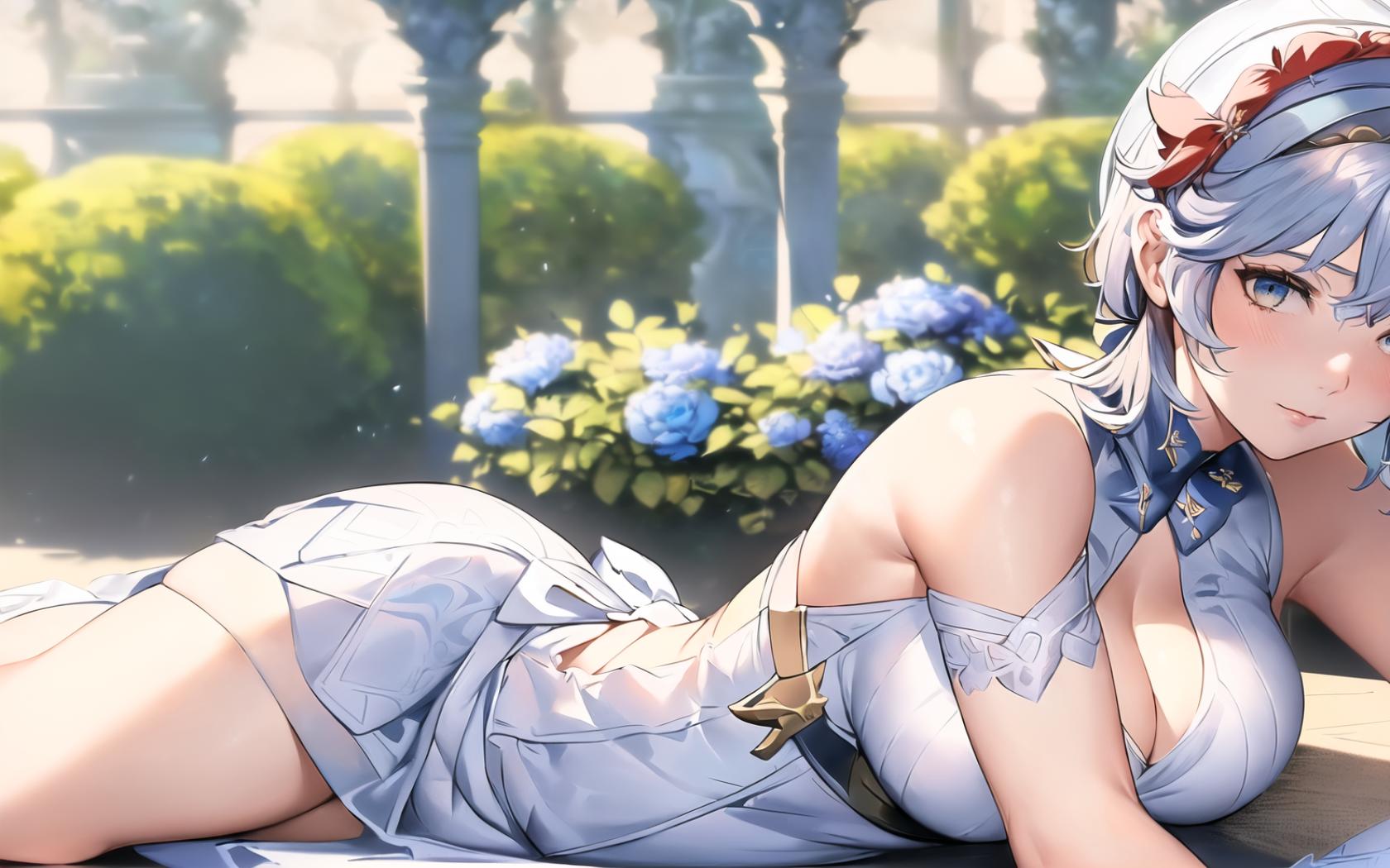 | Prompt | (highly detailed:1.1), (digital art:1.4), (romantic:1.4), (style of Guillaume Seignac:1.9), (epic:1.4,perfect artwork), best quality,dynamic pose,sharp focus,(8k), (4k),(Masterpiece), (Best Quality), fantasy, extremely detailed, intricate, hyper detailed, (perfect face), illustration, clearly worked out detail, intricate, cinematic,(depth of field:1.2), <lora:eula2:1>, eularnd,medium breasts, (light blue hair), ( short blue hair:1.4), short light blue hair, (marron and blue eyes), (1girl, solo:1.4), outdoors, spring, butterflies, (rich medieval garden background, bushes of flowers, white marble statues, white marble fountain,trees), (white flower in the air, bracers of white flower, crown of white flowers, ankle bracers of blue flowers;1.2), (white hat with flowers tied, white lace dress, white chestlace, bare shoulders, bare hands, bare arms:1.5), (lying in flowers:1.3), hot, (using a white fan:1.2), sexy, smile, shy, blush, looking at viewer, |