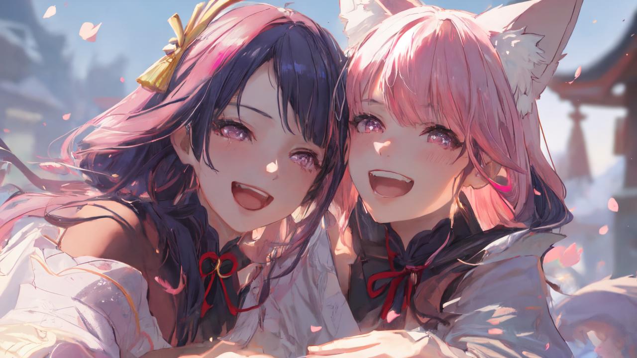 2girls, :d, animal ear fluff, animal ears, bangs, blurry, blurry background, blush, cherry blossoms, falling petals , fox ears, hair ornament, japanese clothes, kimono, long hair, looking at viewer, mole, mole under eye, multiple girls, open mouth, outdoors, petals, pink eyes, pink hair, purple eyes, purple hair, ribbon, sky, smile
