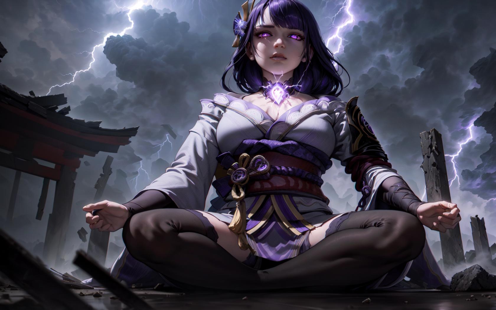 | Prompt | <lora:raidenshogun1:1> ((raidenshogundef levitating high above the ground dust)), ((electric aura)), long braid,purple thighhighs,