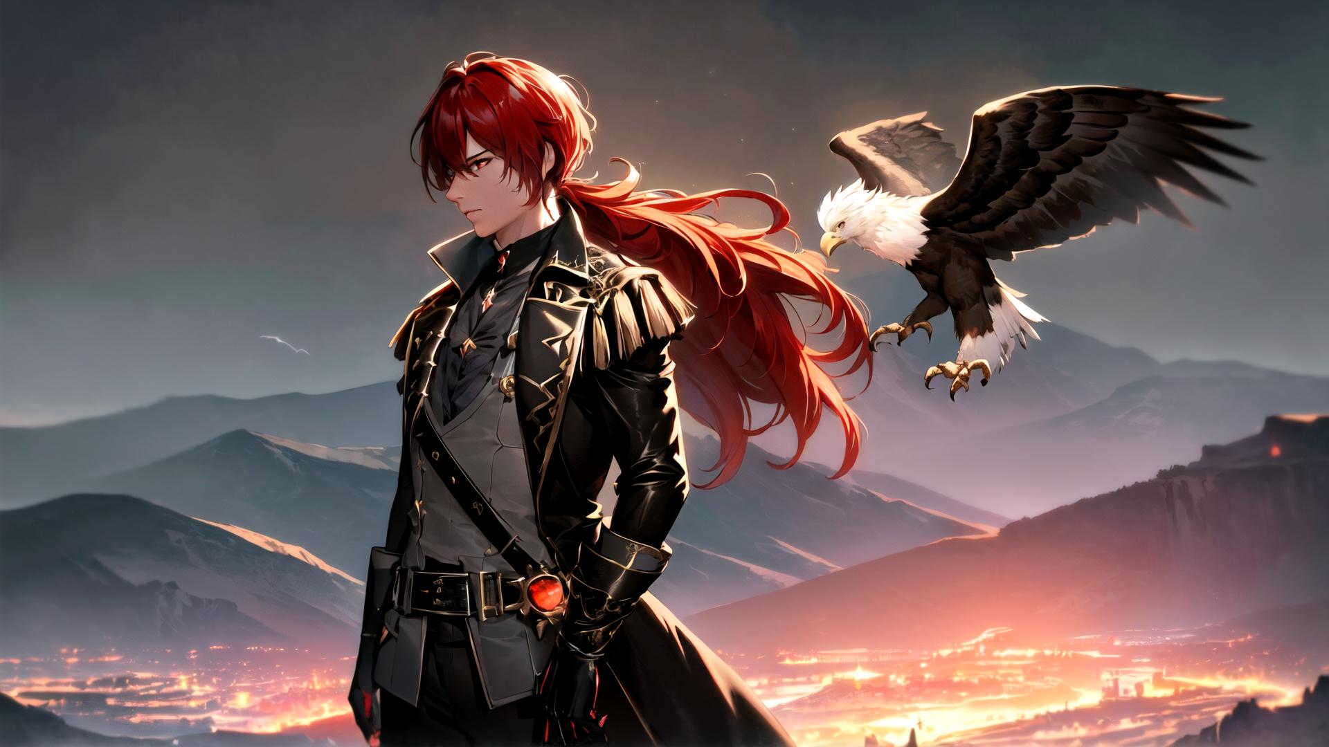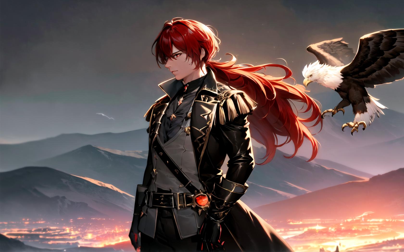 | Prompt | (highly detailed:1.5), (realistic:1.05),(digital art:1.7),,(romantic:1.4, heroic:1.7), (dark atmosphere:1.3), (style of Greg Rutkowski:1.9), (epic:1.5, perfect artwork), best quality,dynamic pose,sharp focus,(8k), (4k),(Masterpiece), (Best Quality), fantasy, extremely detailed, intricate, hyper detailed, (perfect face), illustration,soft lighting, Ultra detailed fantasy environment, clearly worked out detail, intricate, cinematic,(depth of field), ( dramatic lighting:1.6), <lora:Diluc_hardpruned:1>,diluc \(genshin impact\),, gloves, 1boy, bird, red eyes, red hair, male focus, black pants, belt, shirt, pants, vision (genshin impact), black gloves, long sleeves, hair between eyes, bangs, adjusting gloves, closed mouth, jacket, coat, solo, grey shirt, black coat, long hair, black shirt, collared shirt, black belt, open clothes, cropped legs, antenna hair, black jacket, two-tone gloves, belt buckle, ((muscular), (sunset, light rain, dark clouds:1.2), (galaxy background), (releasing an eagle), (volcan, lava, magma, mountains background), (top of the world), (sad), looking at eagle, |