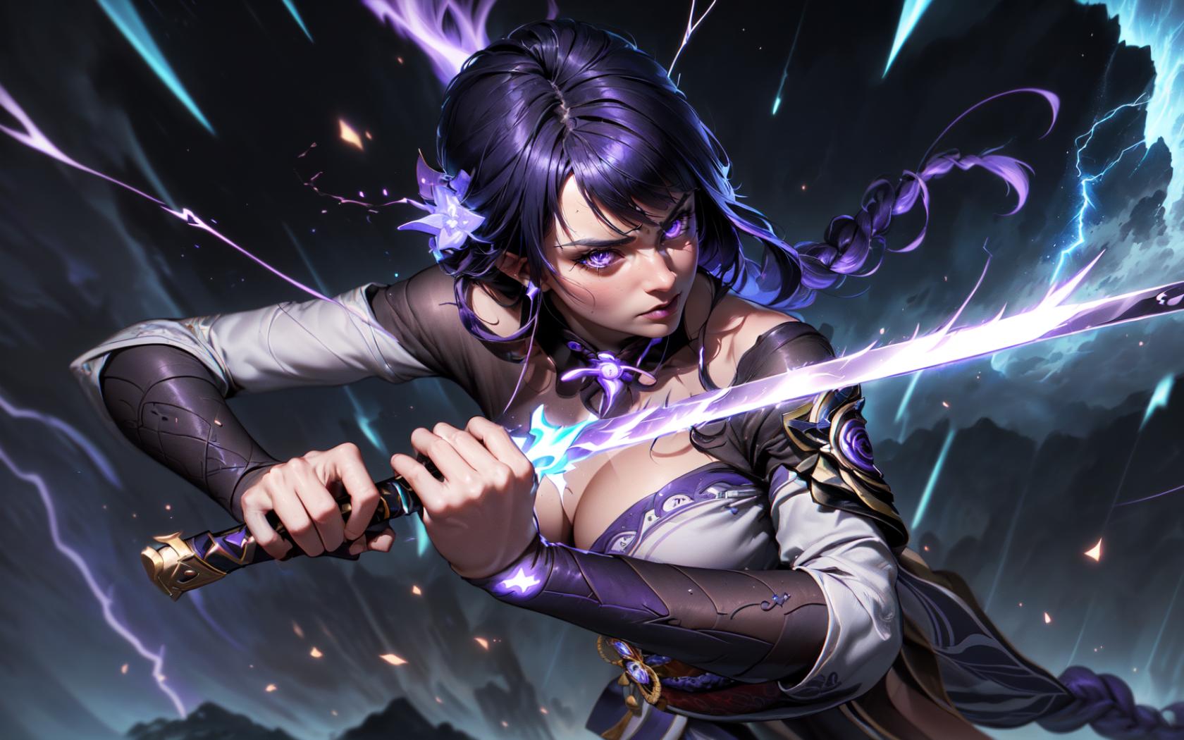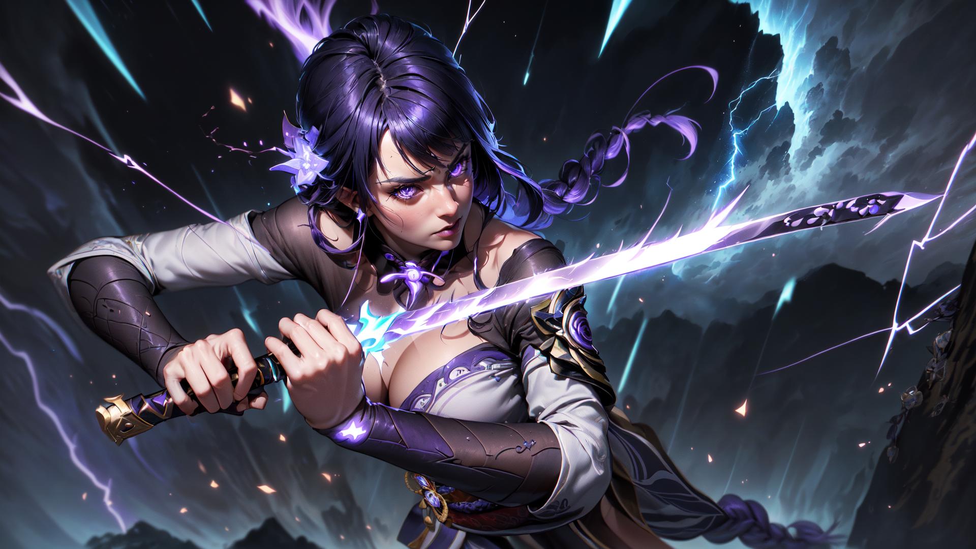 ((((weapon, holding, holding glowing electric musou isshin (genshin impact),fighting viewer with glowing electric purple magical weapon blade)))),