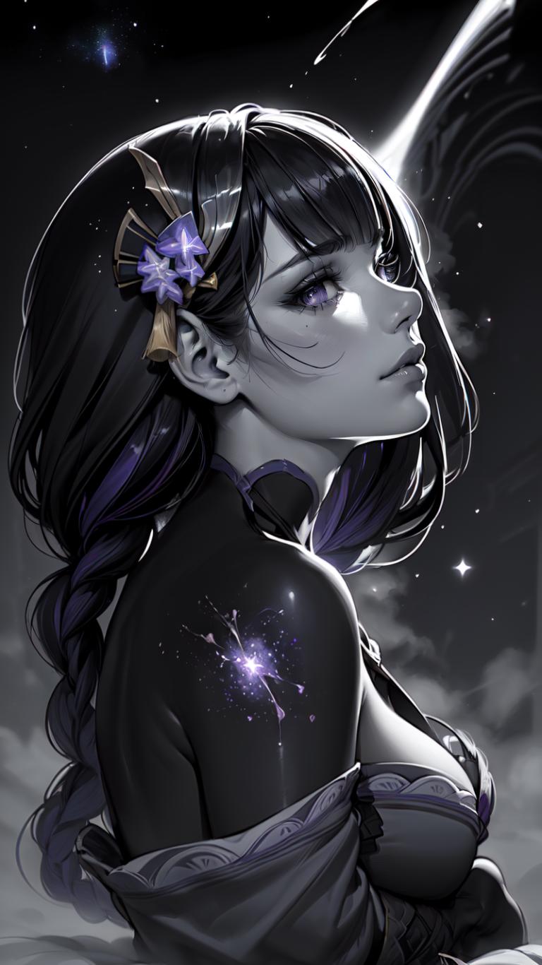 1girl, bangs, braid, braided ponytail, electricity , eyelashes, flower, from side, hair flower, hair ornament, japanese clothes, kimono, large breasts, long hair, looking at viewer, mole, mole under eye, monochrome, off shoulder, parted lips, purple eyes, purple hair, sky, solo, spot color, star (sky), upper body