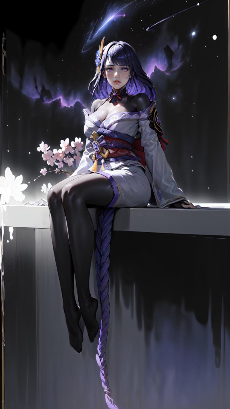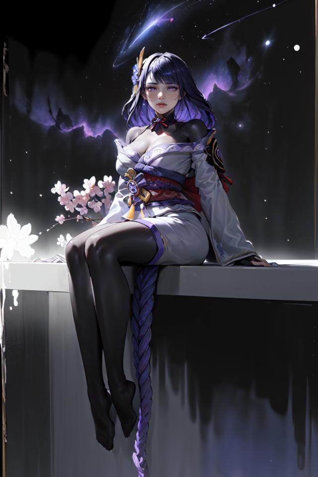 | Prompt | <lora:raidenshogun1:1.3>((full body of raidenshogundef)), ((solo)),(long glowing purple braid),