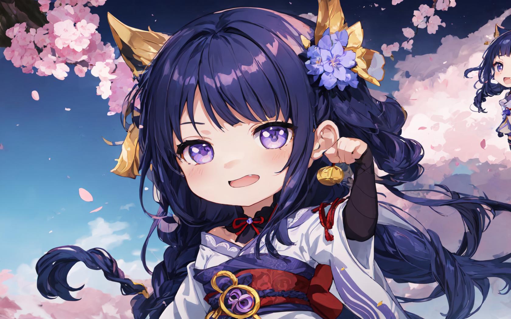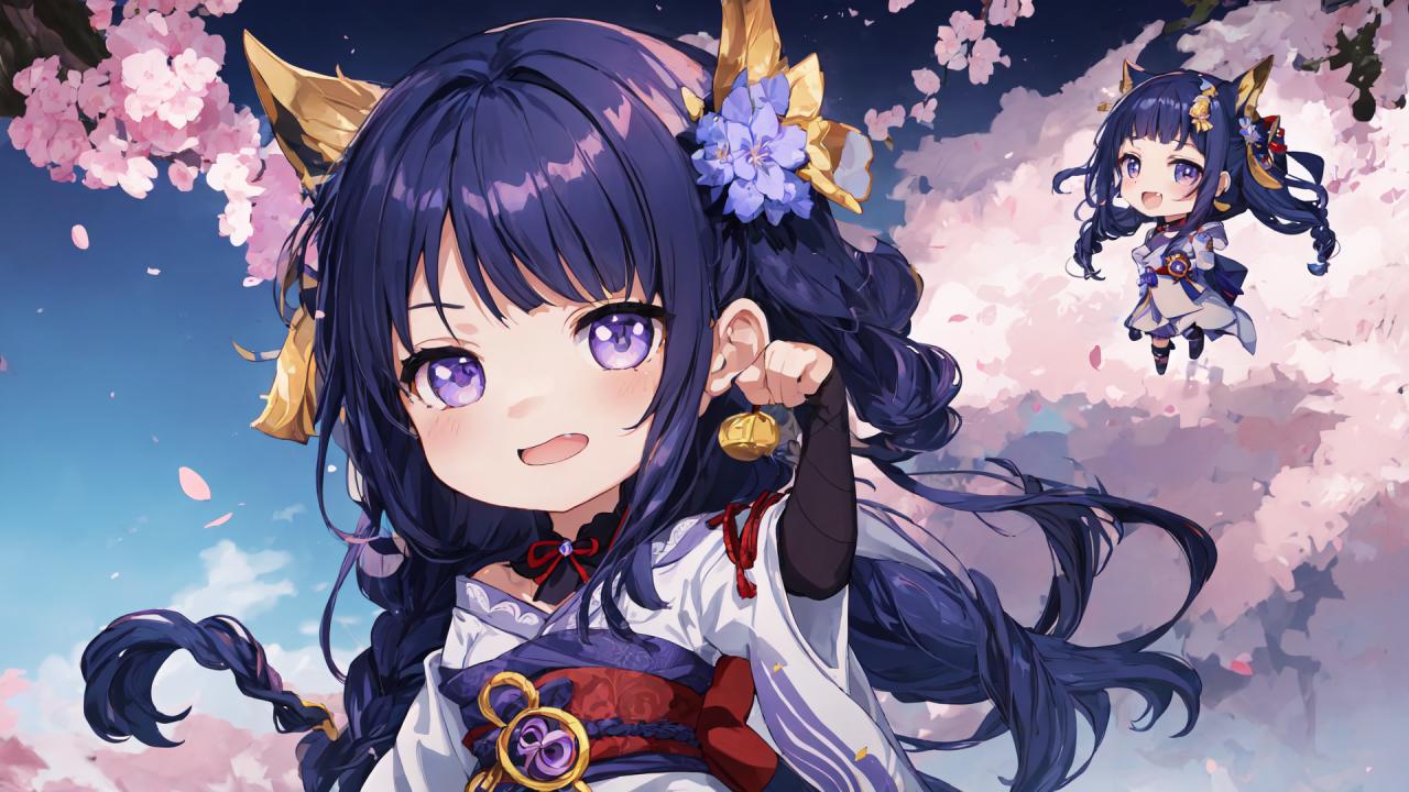 1girl, 2girls, :d, aged down, animal ears, bangs, blunt bangs, blush, braid, cherry blossoms, chibi, coin, fang, flower, hair ornament, japanese clothes, kimono, long hair, long sleeves, looking at viewer, multiple girls, obi, obiage , open mouth, paw pose, petals, purple eyes, purple hair, sash, sidelocks, single braid, skin fang, smile, vision (genshin impact), wide sleeves