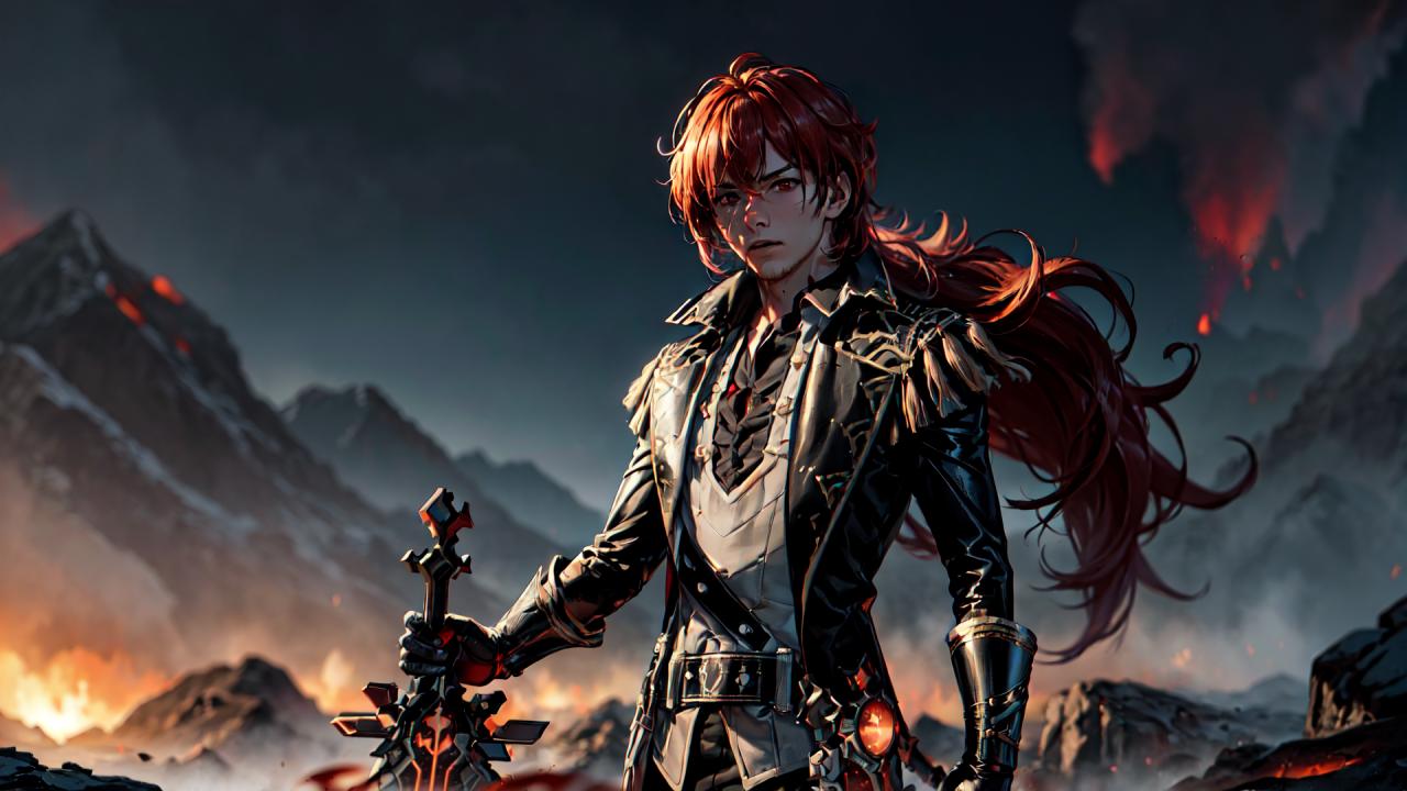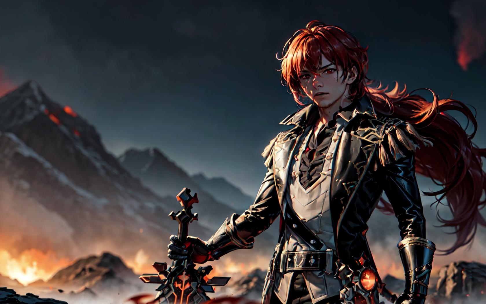 | Prompt | (highly detailed:1.5), (realistic:1.05),(digital art:1.7),,(romantic:1.4, heroic:1.7), (style of Greg Rutkowski:1.9), (epic:1.7, perfect artwork), best quality,dynamic pose,sharp focus,(8k), (4k),(Masterpiece), (Best Quality), fantasy, extremely detailed, intricate, hyper detailed, (perfect face), illustration,soft lighting, Ultra detailed fantasy environment, clearly worked out detail, intricate, cinematic,(Depth of Field: 3m x f/8), ( dramatic lighting:1.6), <lora:Diluc_hardpruned:1.2>,diluc \(genshin impact\),, gloves, 1boy, red eyes, red hair, male focus, black pants, belt, shirt, pants, vision (genshin impact), black gloves, long sleeves, hair between eyes, bangs, adjusting gloves, closed mouth, jacket, coat, solo, grey shirt, black coat, long hair, black shirt, collared shirt, black belt, open clothes, cropped legs, antenna hair, black jacket, two-tone gloves, belt buckle, (sunset, light rain, dark clouds:1.2), (standing upright left of the picture, slashing viewer with black and glowing red sword:1.7), (volcan, lava, magma, mountains background), (top of the world), embers, burning embers, flames, fire, (wind), angry, (facing viewer:1.4,looking at viewer:1.3), |
