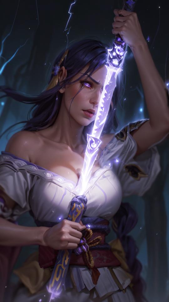 (((glowing electric musou isshin (genshin impact),pulling glowing electric purple magical weapon blade over one eye))),
