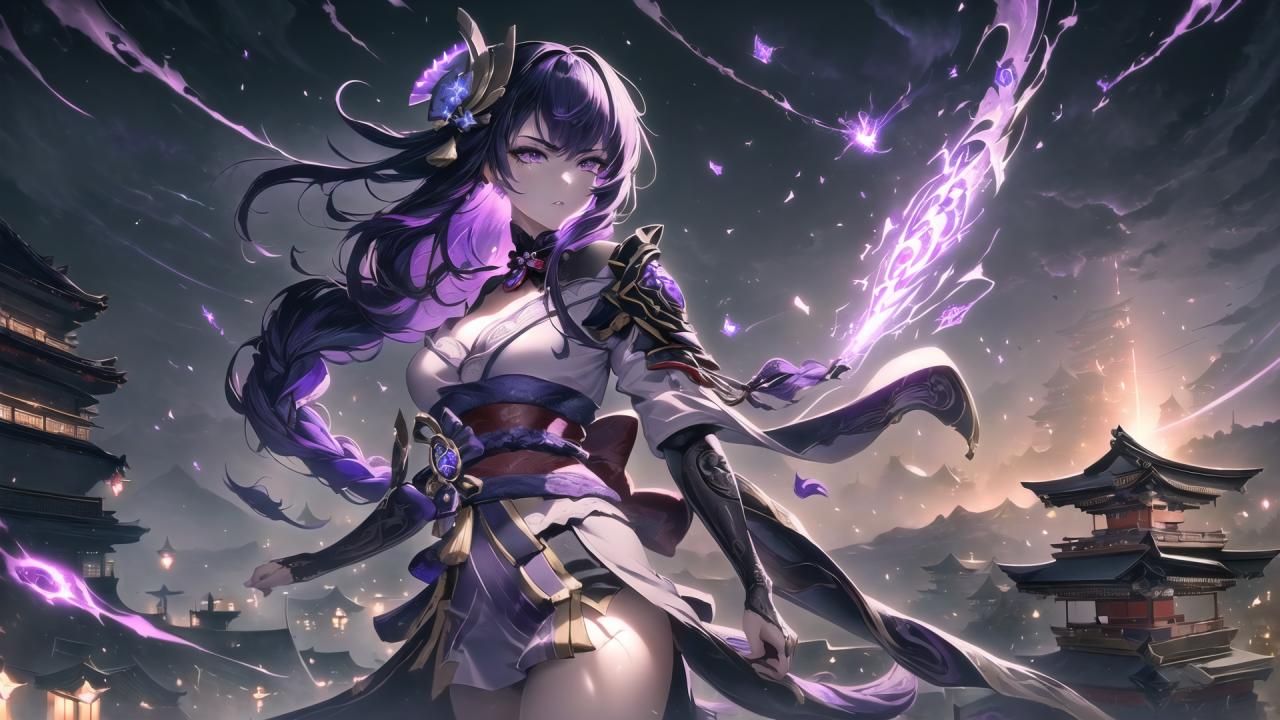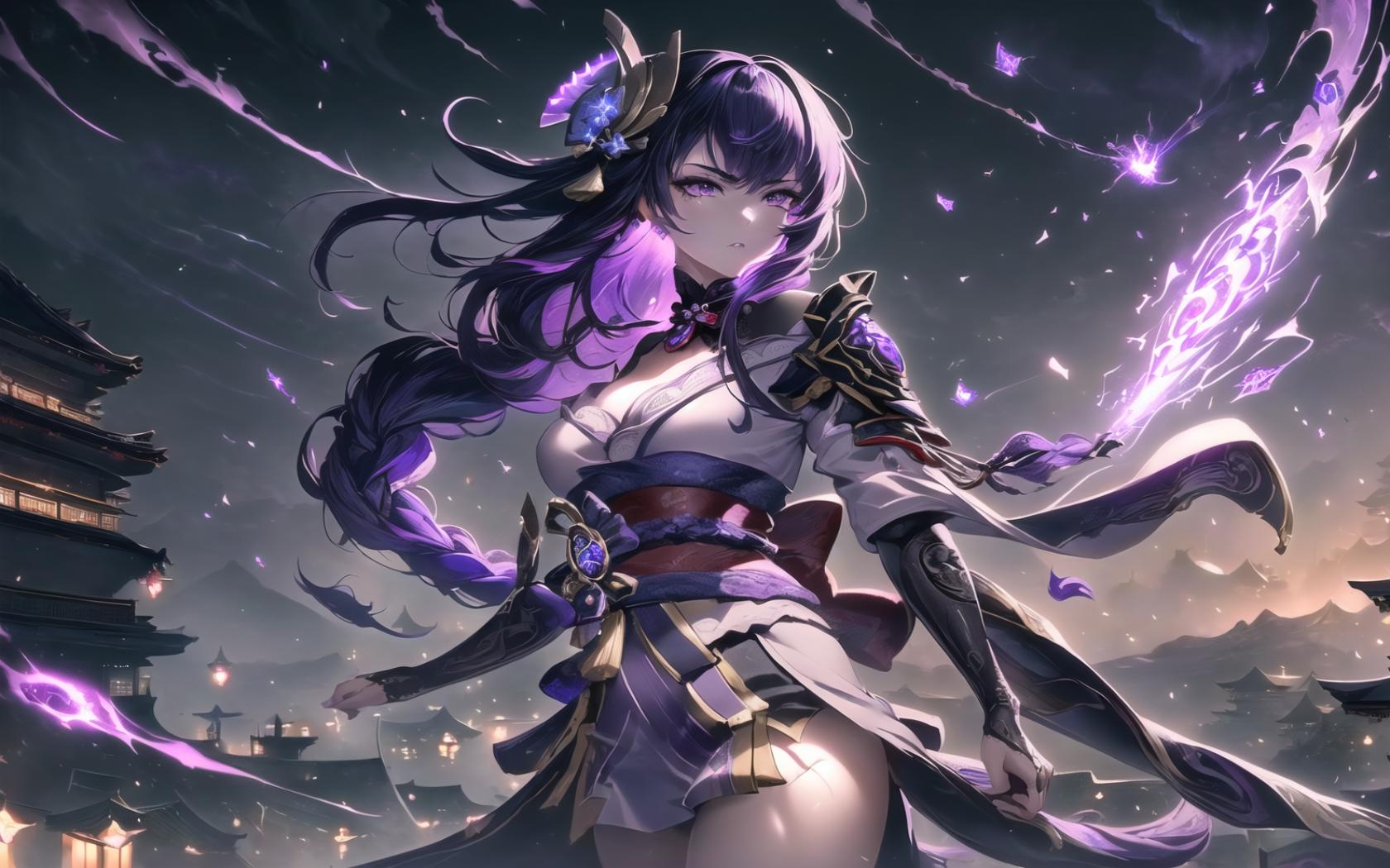 | Prompt | (dramatic:1.3),(highly detailed:1.5), (realistic:1.05),(digital art:1.7),(romantic:1.4), ,(dark fantasy art:1.6), <lora:beautiful-eyes:0.7>, (epic:1.5, perfect artwork), best quality,dynamic pose,sharp focus,(8k), (4k),(Masterpiece), (Best Quality), fantasy, extremely detailed, intricate, hyper detailed, (perfect face), illustration,soft lighting, Ultra detailed fantasy environment, clearly worked out detail, intricate, cinematic,(depth of field), ( dramatic lighting:1.2), <lora:raidenshogun1:1>,raidenshogundef,1girl, solo,very long hair,vision (genshin impact,shoulder armor, tomoe (symbol),((holding musou isshin (genshin impact))), night, thunder, lightnings, wind, dark clouds, maelstrom, (end of the world), (thunderstorm background), outdoors, (top of the world, standing on the roof of medieval japanese temple:1.2), medieval japanese town below, (angry:1.2), agressive, turned to viewer, looking at viewer, facing viewer, <lora:kVoidEnergy:0.5>,purple V0id3nergy, |