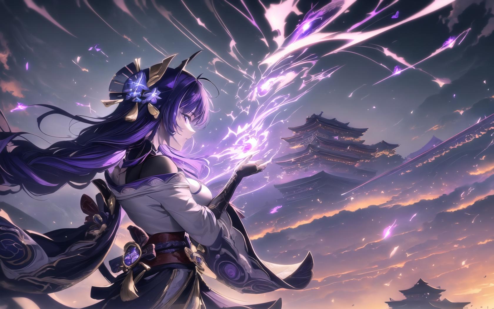 | Prompt | (dramatic:1.3),(highly detailed:1.5), (realistic:1.05),(digital art:1.7),(romantic:1.4), ,(heroic:1.1), <lora:beautiful-eyes:0.7>, (epic:1.5, perfect artwork), best quality,dynamic pose,sharp focus,(8k), (4k),(Masterpiece), (Best Quality), fantasy, extremely detailed, intricate, hyper detailed, (perfect face), illustration,soft lighting, Ultra detailed fantasy environment, clearly worked out detail, intricate, cinematic,(depth of field), ( dramatic lighting:1.2), <lora:raidenshogun1:1>,raidenshogundef,1girl, solo,very long hair,vision (genshin impact,shoulder armor, tomoe (symbol),((holding musou isshin (genshin impact))), night, thunder, lightnings, wind, dark clouds, maelstrom, (end of the world), (thunderstorm background), outdoors, (top of the world, standing on the roof of medieval japanese temple:1.2), medieval japanese town below, (angry:1.2), agressive, (fighting:1.4), turned to viewer, looking at viewer, facing viewer, <lora:kVoidEnergy:0.5>,purple V0id3nergy, |