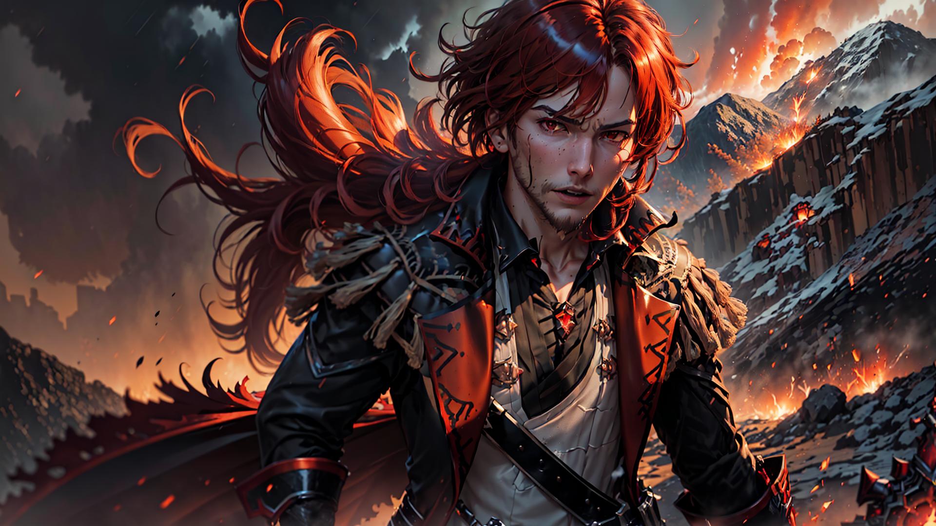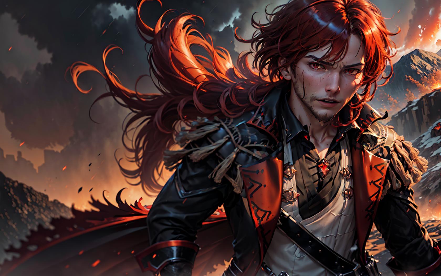 | Prompt | (highly detailed:1.5), (realistic:1.05),(digital art:1.7),,(romantic:1.4, heroic:1.7), (style of Greg Rutkowski:1.9), (epic:1.7, perfect artwork), best quality,dynamic pose,sharp focus,(8k), (4k),(Masterpiece), (Best Quality), fantasy, extremely detailed, intricate, hyper detailed, (perfect face), illustration,soft lighting, Ultra detailed fantasy environment, clearly worked out detail, intricate, cinematic,(Depth of Field: 3m x f/8), ( dramatic lighting:1.6), <lora:Diluc_hardpruned:1.2>,diluc \(genshin impact\),, gloves, 1boy, red eyes, red hair, male focus, black pants, belt, shirt, pants, vision (genshin impact), black gloves, long sleeves, hair between eyes, bangs, adjusting gloves, closed mouth, jacket, coat, solo, grey shirt, black coat, long hair, black shirt, collared shirt, black belt, open clothes, cropped legs, antenna hair, black jacket, two-tone gloves, belt buckle, (sunset, light rain, dark clouds:1.2), ( fighting viewer with black and glowing red sword, about to hit:1.7), (volcan, lava, magma, mountains background), (top of the world), embers, burning embers, flames, fire, (wind), angry, (facing viewer:1.4,looking at viewer:1.3), |