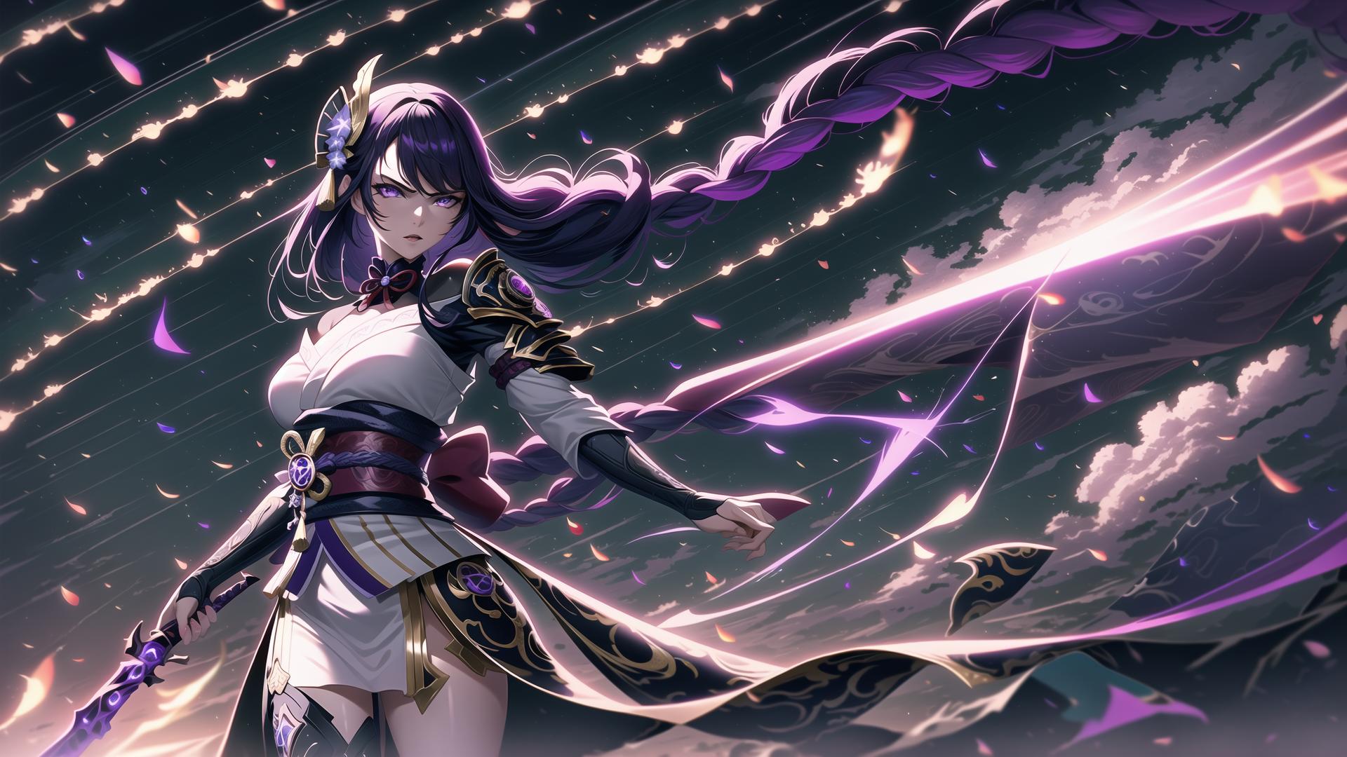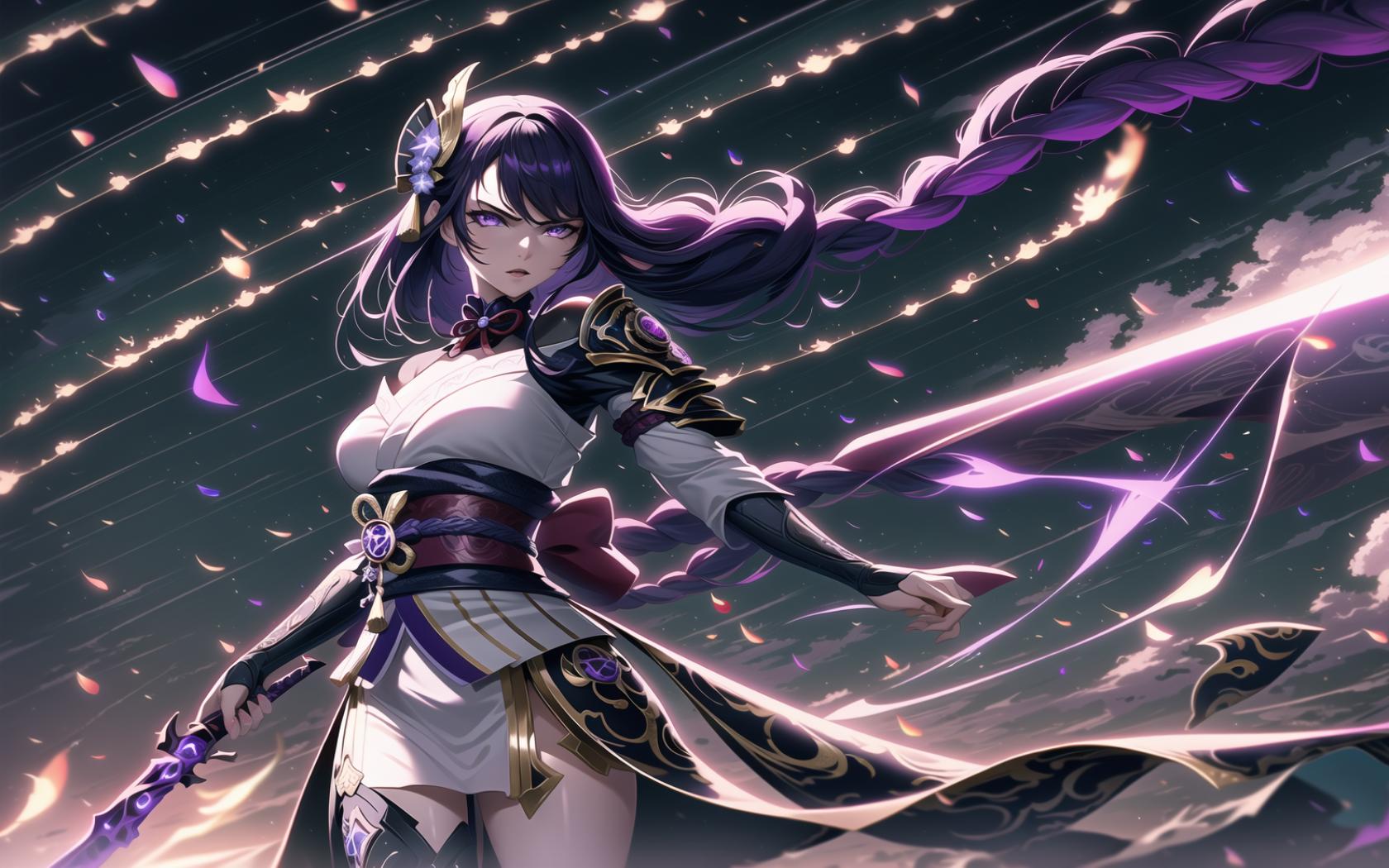 Prompt (dramatic:1.3),(highly detailed:1.5), (realistic:1.05),(digital art:1.9),(romantic:1.4), ,(heroic:1.1), <lora:beautiful-eyes:0.7>, (epic:1.8, perfect artwork), best quality,dynamic pose,sharp focus,(8k), (4k),(Masterpiece), (Best Quality), fantasy, extremely detailed, intricate, hyper detailed, (perfect face), illustration,soft lighting, Ultra detailed fantasy environment, clearly worked out detail, intricate, cinematic,(depth of field), ( dramatic lighting:1.2), <lora:raidenshogun1:1>,raidenshogundef,1girl, solo,very long hair,vision (genshin impact,shoulder armor, black thighhighs, tomoe (symbol), night, thunder, lightnings, wind, dark clouds, maelstrom, (end of the world), (galaxy background:1.3), (holding weapon), outdoors, ((wind)), light rain, sakura leaves in the wind, sakura blossoms, (top of the world, standing on the roof of medieval japanese temple:1.2), (angry:1.2), agressive, (dynamic pose:1.4), (looking at viewer:1.5), <lora:kVoidEnergy:0.4>,purple V0id3nergy,