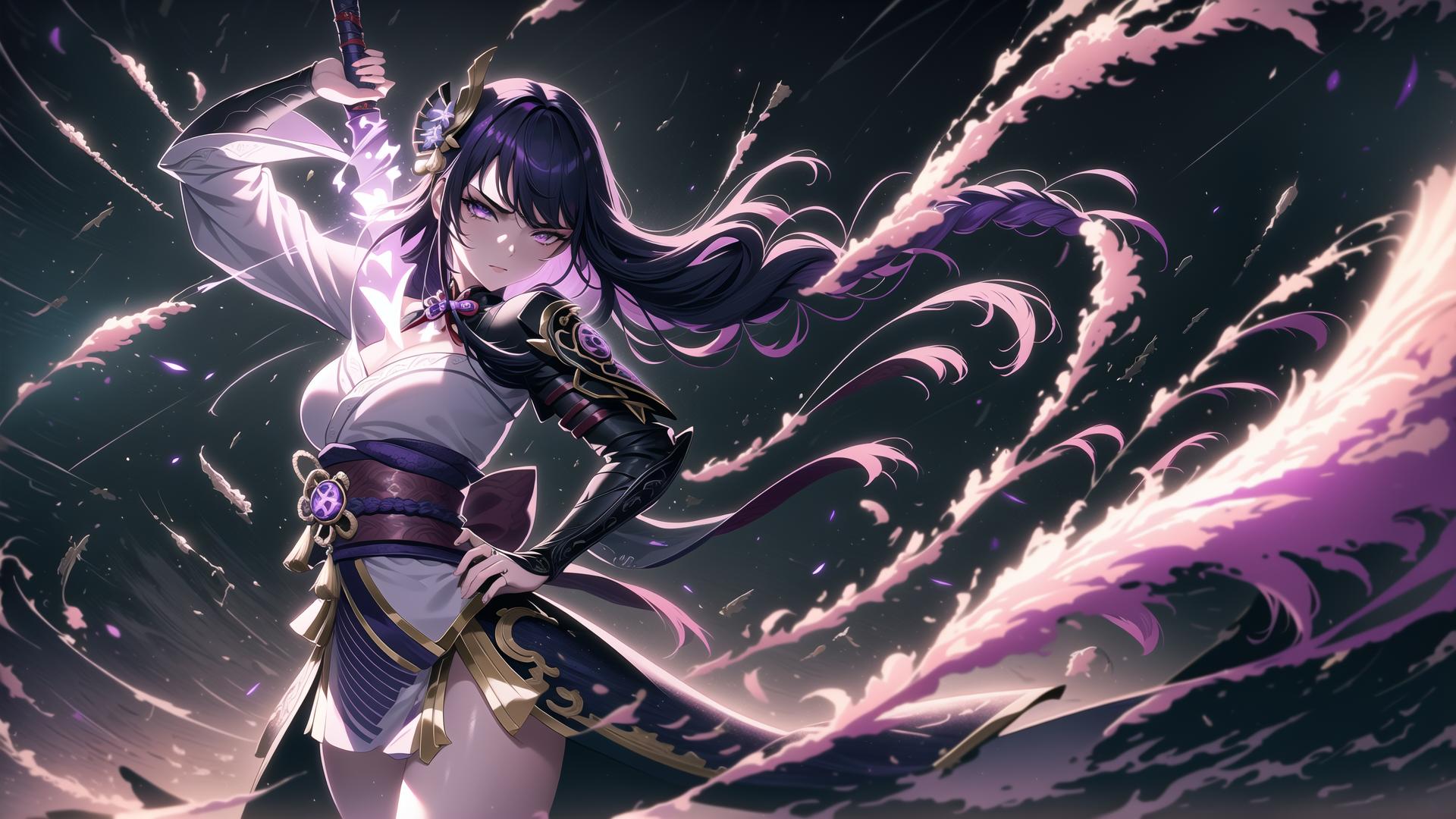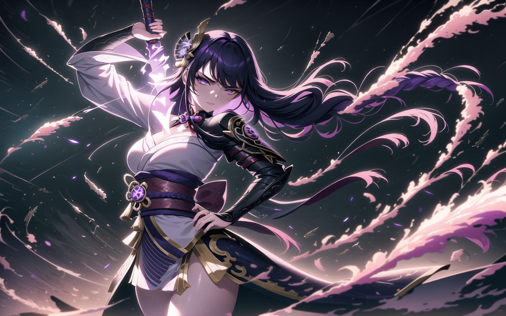 Prompt (dramatic:1.3),(highly detailed:1.5), (realistic:1.05),(digital art:1.9),(romantic:1.4), ,(heroic:1.1), <lora:beautiful-eyes:0.7>, (epic:1.8, perfect artwork), best quality,dynamic pose,sharp focus,(8k), (4k),(Masterpiece), (Best Quality), fantasy, extremely detailed, intricate, hyper detailed, (perfect face), illustration,soft lighting, Ultra detailed fantasy environment, clearly worked out detail, intricate, cinematic,(depth of field), ( dramatic lighting:1.2), <lora:raidenshogun1:1>,raidenshogundef,1girl, solo,very long hair,vision (genshin impact,shoulder armor, black thighhighs, tomoe (symbol), night, thunder, lightnings, wind, dark clouds, maelstrom, (end of the world), (galaxy background:1.3), (holding weapon), outdoors, ((wind)), light rain, sakura leaves in the wind, sakura blossoms, (top of the world, standing on the roof of medieval japanese temple:1.2), (angry:1.2), agressive, (dynamic pose:1.4), (looking at viewer:1.5), <lora:kVoidEnergy:0.4>,purple V0id3nergy,