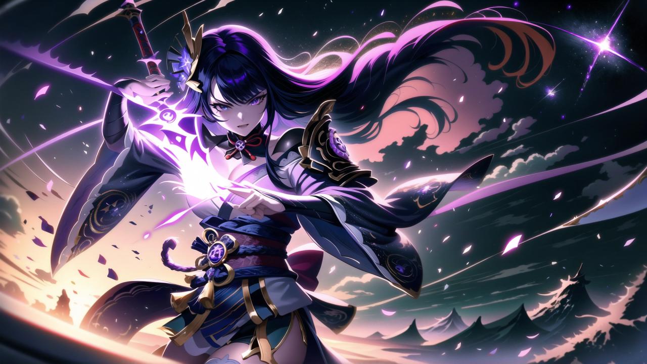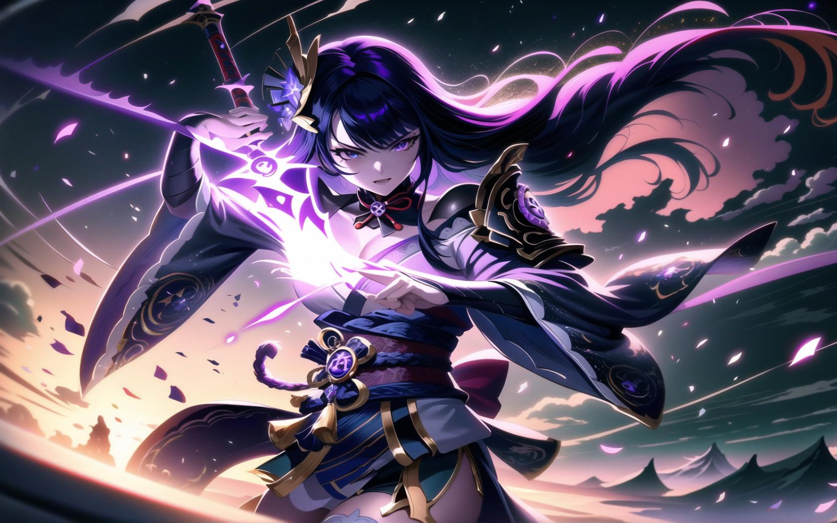 | Prompt | (dramatic:1.3),(highly detailed:1.5), (realistic:1.05),(digital art:1.9),(romantic:1.4), ,(heroic:1.1), <lora:beautiful-eyes:0.7>, (epic:1.3, perfect artwork), best quality,dynamic pose,sharp focus,(8k), (4k),(Masterpiece), (Best Quality), fantasy, extremely detailed, intricate, hyper detailed, (perfect face), illustration,soft lighting, Ultra detailed fantasy environment, clearly worked out detail, intricate, cinematic,(depth of field), ( dramatic lighting:1.2), <lora:raidenshogun1:1>,raidenshogundef,1girl, solo,vision (genshin impact,shoulder armor, black thighhighs, night, thunder, lightnings, wind, dark clouds, maelstrom, (end of the world), (galaxy background:1.3), (holding weapon), outdoors, ((wind)), light rain, sakura leaves in the wind, sakura blossoms, (top of the world, standing on the roof of medieval japanese temple:1.2), (angry:1.2), agressive, (dynamic pose:1.4), (fighting:1.5), (looking at viewer:1.5), <lora:kVoidEnergy:0.4>,purple V0id3nergy, |