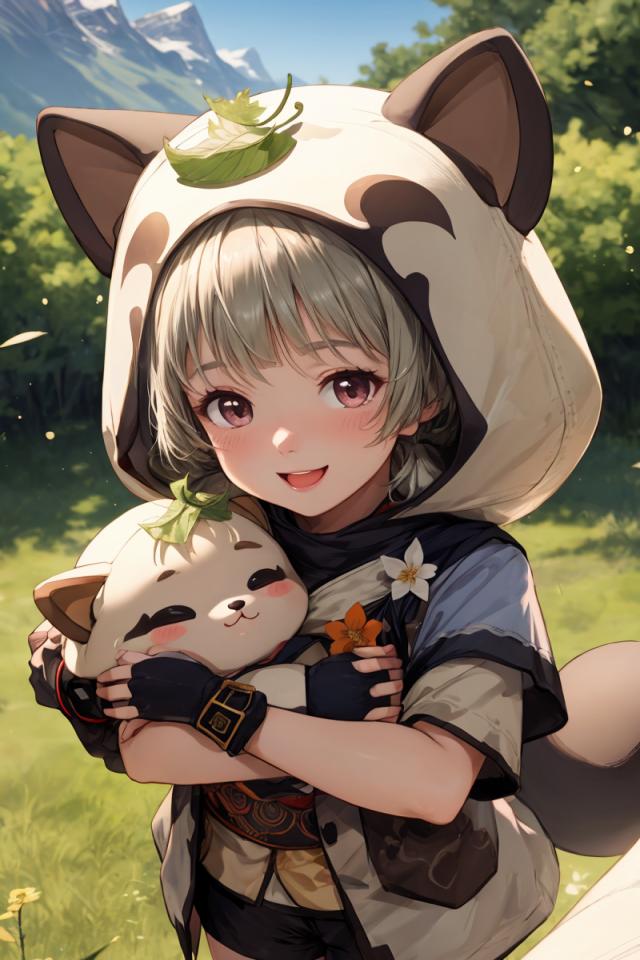 1girl, :d, animal ears, animal hood, animal hug , bangs, black gloves, black scarf, black shorts, blush, day, fake animal ears, fingerless gloves, flower, gloves, grass, grey hair, holding, hood, japanese clothes, leaf, leaf on head, looking at viewer, open mouth, outdoors, purple eyes, raccoon ears, red eyes, short hair, short shorts, short sleeves, shorts, smile, solo, tail