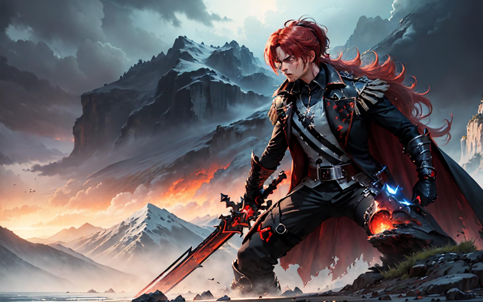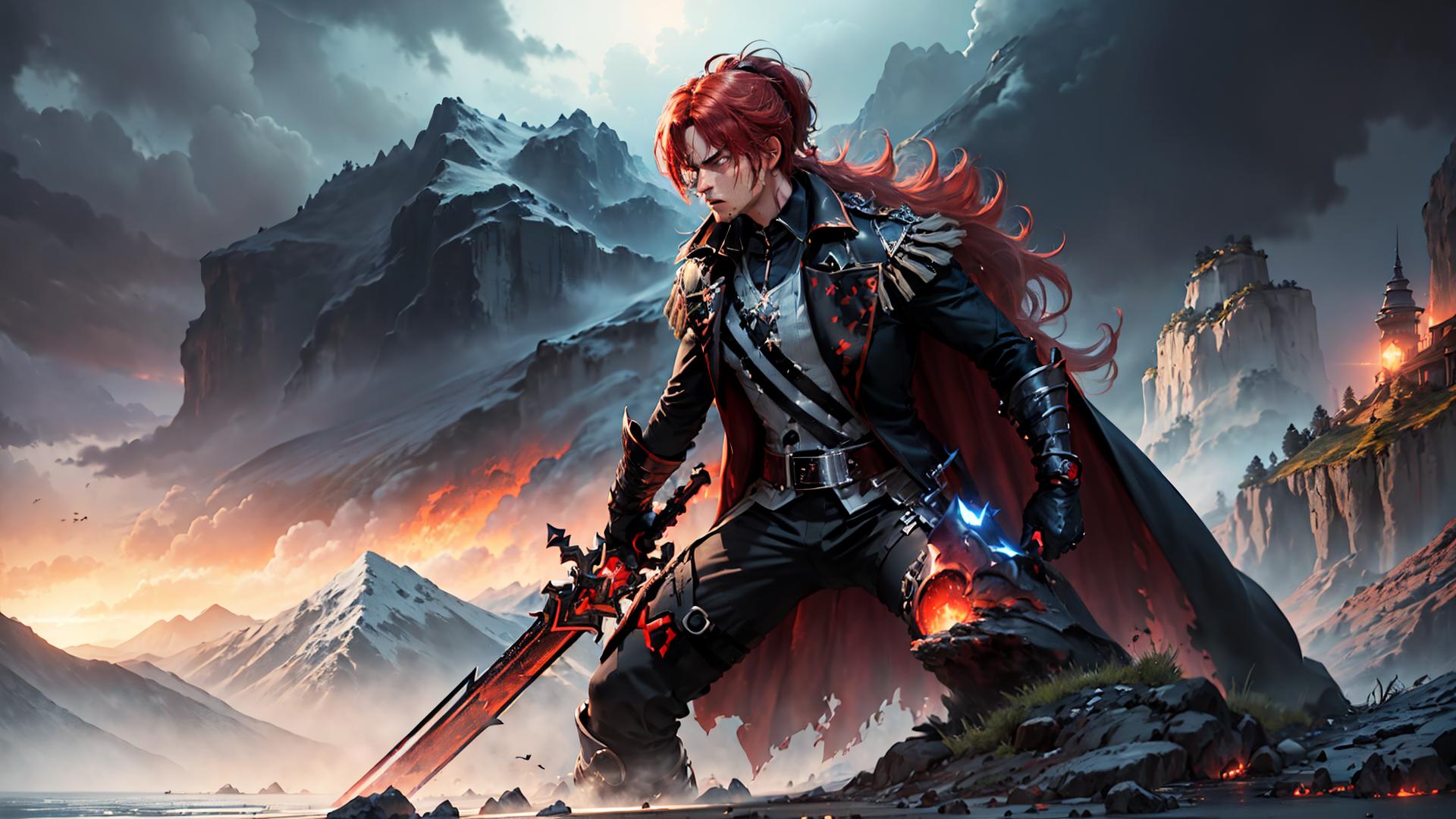| Prompt | (highly detailed:1.5), (realistic:1.05),(digital art:1.7),,(romantic:1.4, heroic:1.7), (dark atmosphere:1.3), (style of Greg Rutkowski:1.7), (epic:1.5, perfect artwork), best quality,dynamic pose,sharp focus,(8k), (4k),(Masterpiece), (Best Quality), fantasy, extremely detailed, intricate, hyper detailed, (perfect face), illustration,soft lighting, Ultra detailed fantasy environment, clearly worked out detail, intricate, cinematic,(depth of field), ( dramatic lighting:1.6), <lora:Diluc_hardpruned:1>,diluc \(genshin impact\),, gloves, 1boy, red eyes, red hair, male focus, black pants, belt, shirt, pants, vision (genshin impact), black gloves, long sleeves, hair between eyes, bangs, adjusting gloves, closed mouth, jacket, coat, solo, grey shirt, black coat, long hair, black shirt, collared shirt, black belt, open clothes, cropped legs, antenna hair, black jacket, two-tone gloves, belt buckle, (sunset, light rain, dark clouds:1.2), (galaxy background), (holding glowing huge black and red sword:1.5), (standing, fighting stance:1.6), (volcan, lava, magma, mountains background), (top of the world), (angry, looking at viewer:1.3), full body:1.2, |