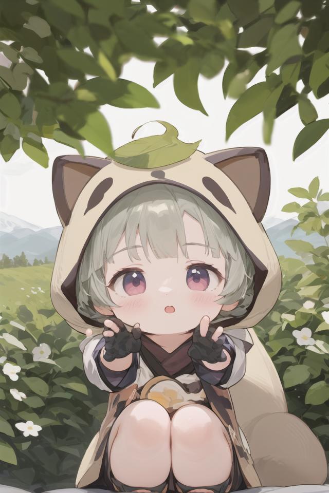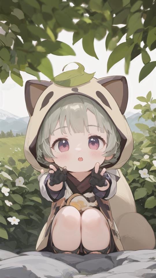 1girl, animal ears, animal hood, bangs, black gloves, black shorts, blunt bangs, blush, day, double v, fake animal ears, fake tail, fingerless gloves, flower, gloves, grey hair, hood, hood up, japanese clothes, kimono, leaf, leaf on head, looking at viewer, open mouth, outdoors, parted lips, purple eyes, raccoon ears, raccoon tail, short hair, solo, squatting, tail, toeless footwear , tree, v, white flower
