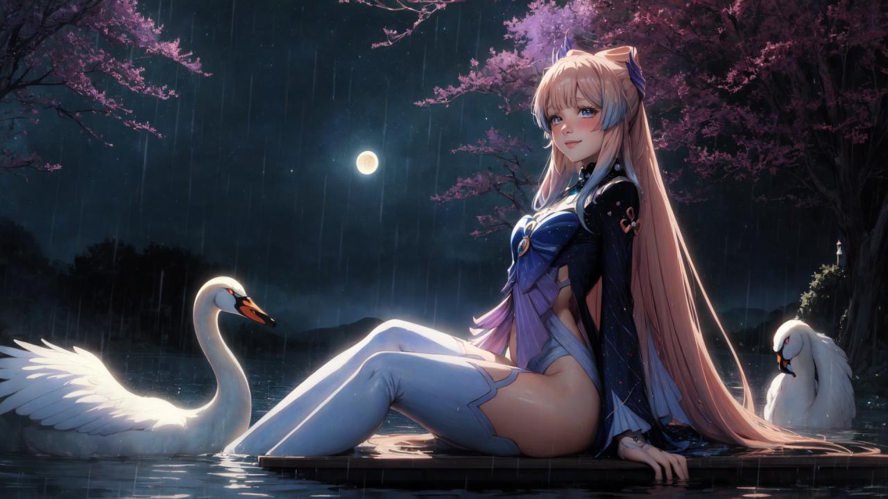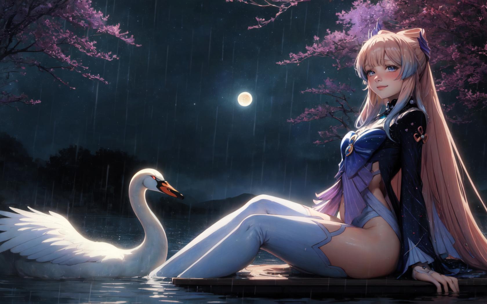 1girl, animal, bangs, bird, blue eyes, blue hair, blunt bangs, blush, bow-shaped hair , from side, full moon, gloves, gradient hair, hair ornament, long hair, long sleeves, looking at viewer, moon, multicolored hair, night, night sky, outdoors, pink hair, purple eyes, rain, shorts, sitting, sky, smile, solo, thighhighs, tree, very long hair, vision (genshin impact), water, water drop, white thighhighs, wide sleeves