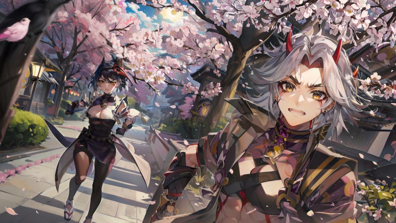 | Prompt | (medieval japanese town background,sakura, sakura trees, sakura blossoms,spring,sun,day),((running)) ADD COMM (manga, anime),((running)),epic ADDBASE <lora:itto:1>1boy, male focus,(muscular), (running,scared,afraid,red horns) ADDCOL <lora:kujousara1:1>(kujousaradef),1girl,running,((angry)),holding huge black club, 1girl, mask, gloves, bangs, mask on head, short hair,bird mask, black gloves, detached sleeves, black hair, blue hair, black bodysuit, hair between eyes, eyes visible through hair, wide sleeves,black pantyhose |