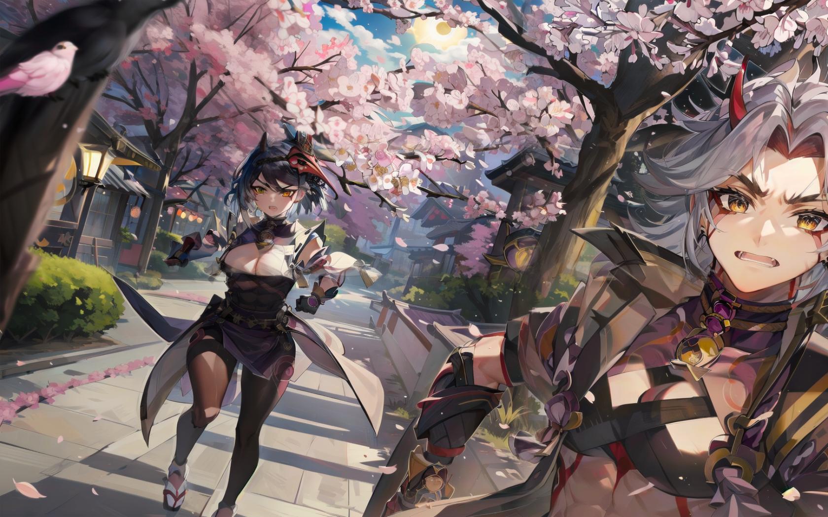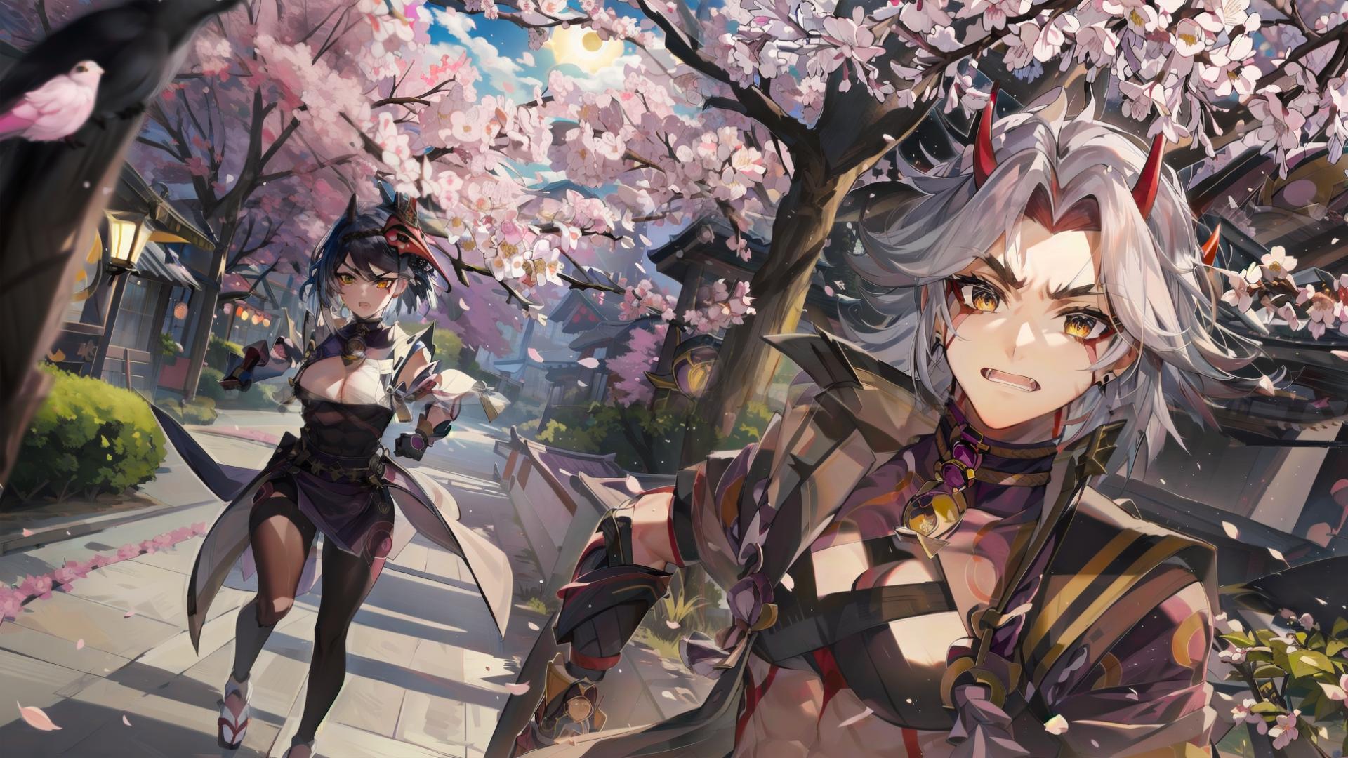 1boy, 1girl, bangs, bird, bird mask , black bodysuit, black gloves, black hair, cherry blossoms, cleavage, detached sleeves, facepaint, facial mark, geta, gloves, hand on hip, holding, horns, japanese clothes, jewelry, large breasts, long hair, looking at viewer, mask, mask on head, medium breasts, moon, night, oni horns, open mouth, outdoors, parted bangs, petals, short hair, spikes, stairs, tree, vision (genshin impact), white hair, yellow eyes