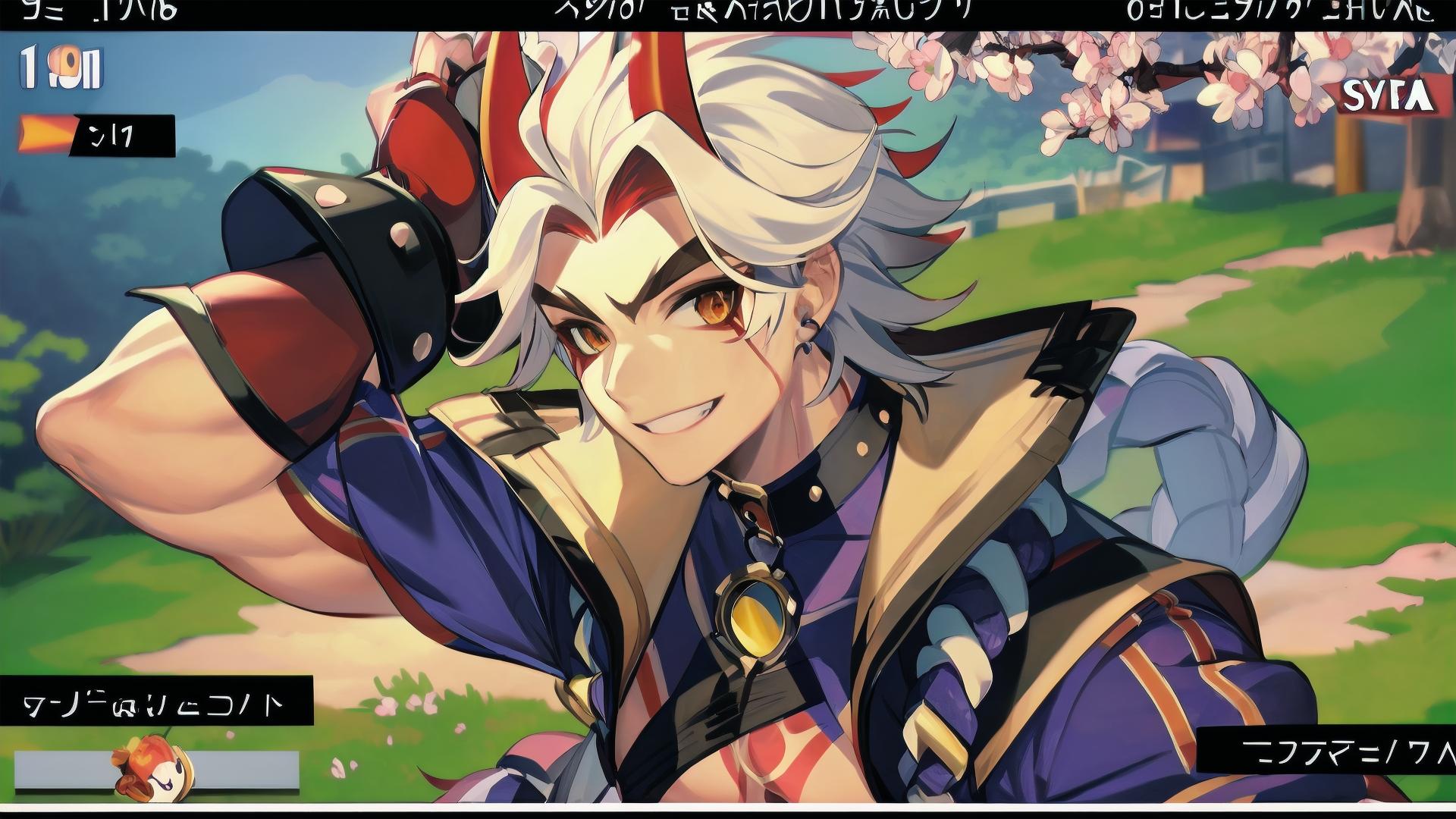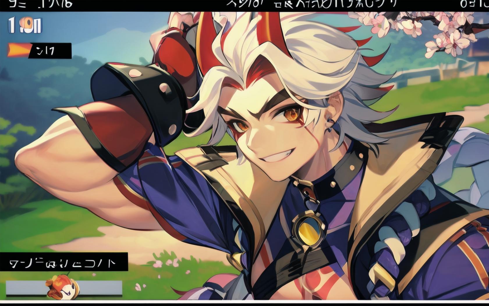 | Prompt | (sega master system graphics style:1.5), <lora:itto:1>1boy, male focus,(muscular), (red horns),smile,white hair,skirt, japanese medieval town background, spring, sakura, |