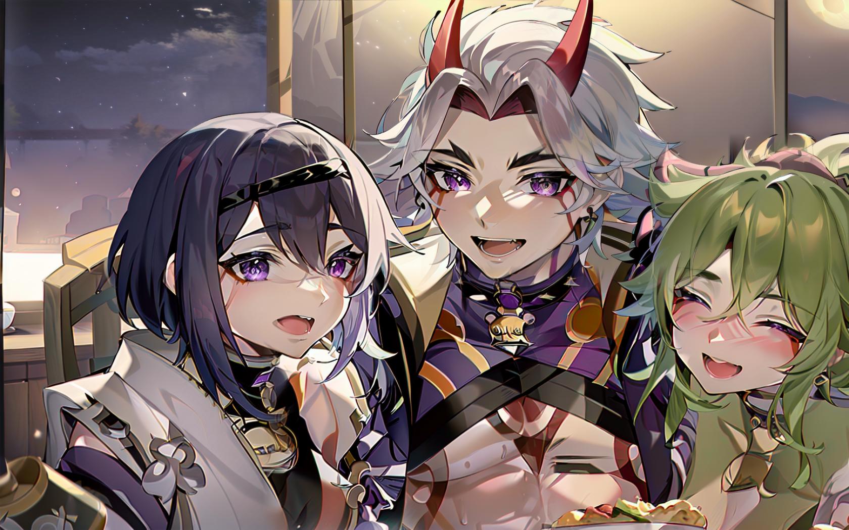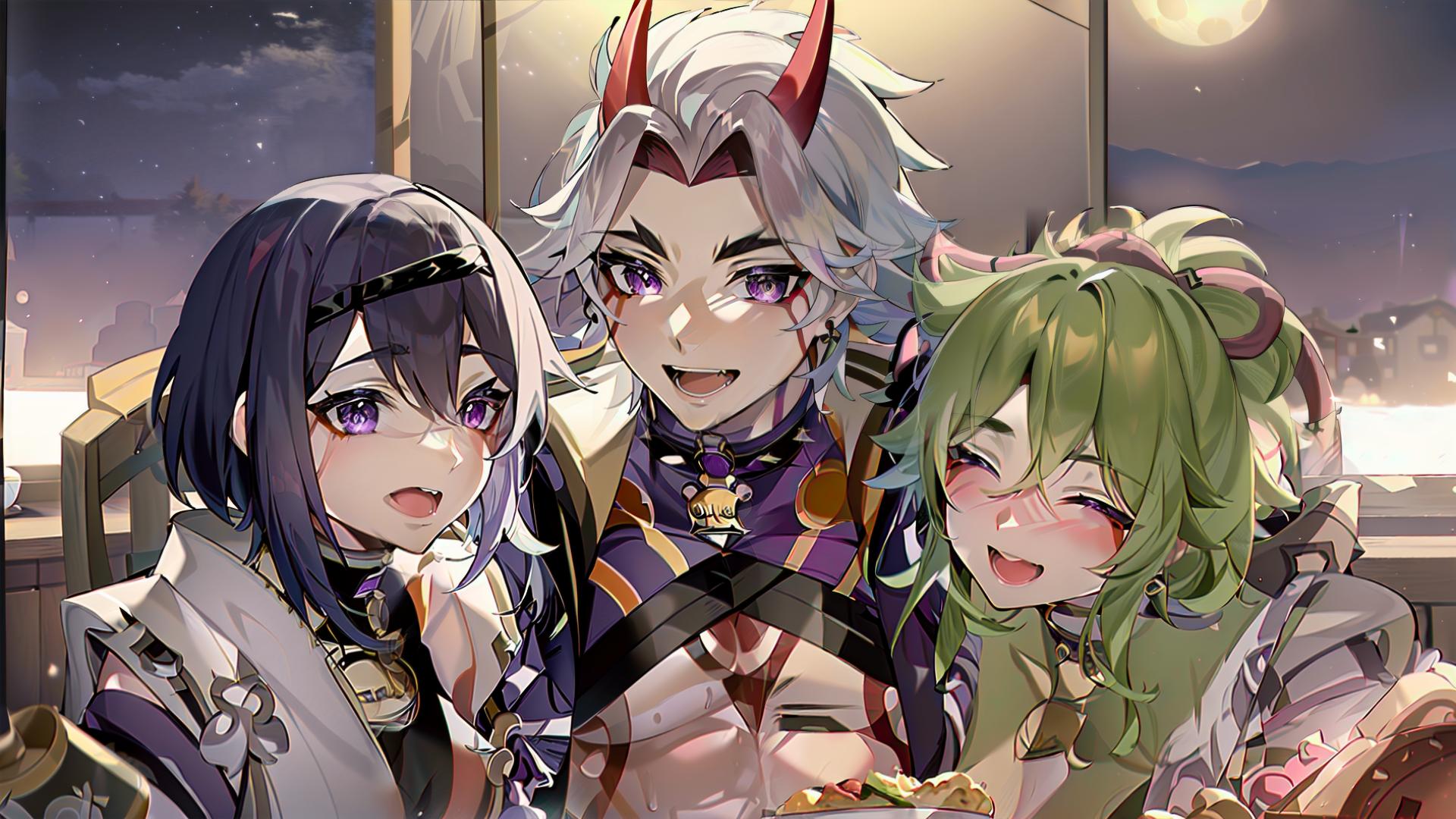 1boy, 2girls, :d, abs, bangs, black hair, blush, body markings , closed eyes, crop top, cup, earrings, fangs, food, full moon, green hair, hair between eyes, hair ornament, horns, japanese clothes, jewelry, long hair, looking at viewer, mask, moon, multiple girls, night, night sky, oni, oni horns, open mouth, outdoors, parted bangs, purple eyes, red horns, short hair, sidelocks, sky, smile, spikes, upper body, vision (genshin impact), white hair
