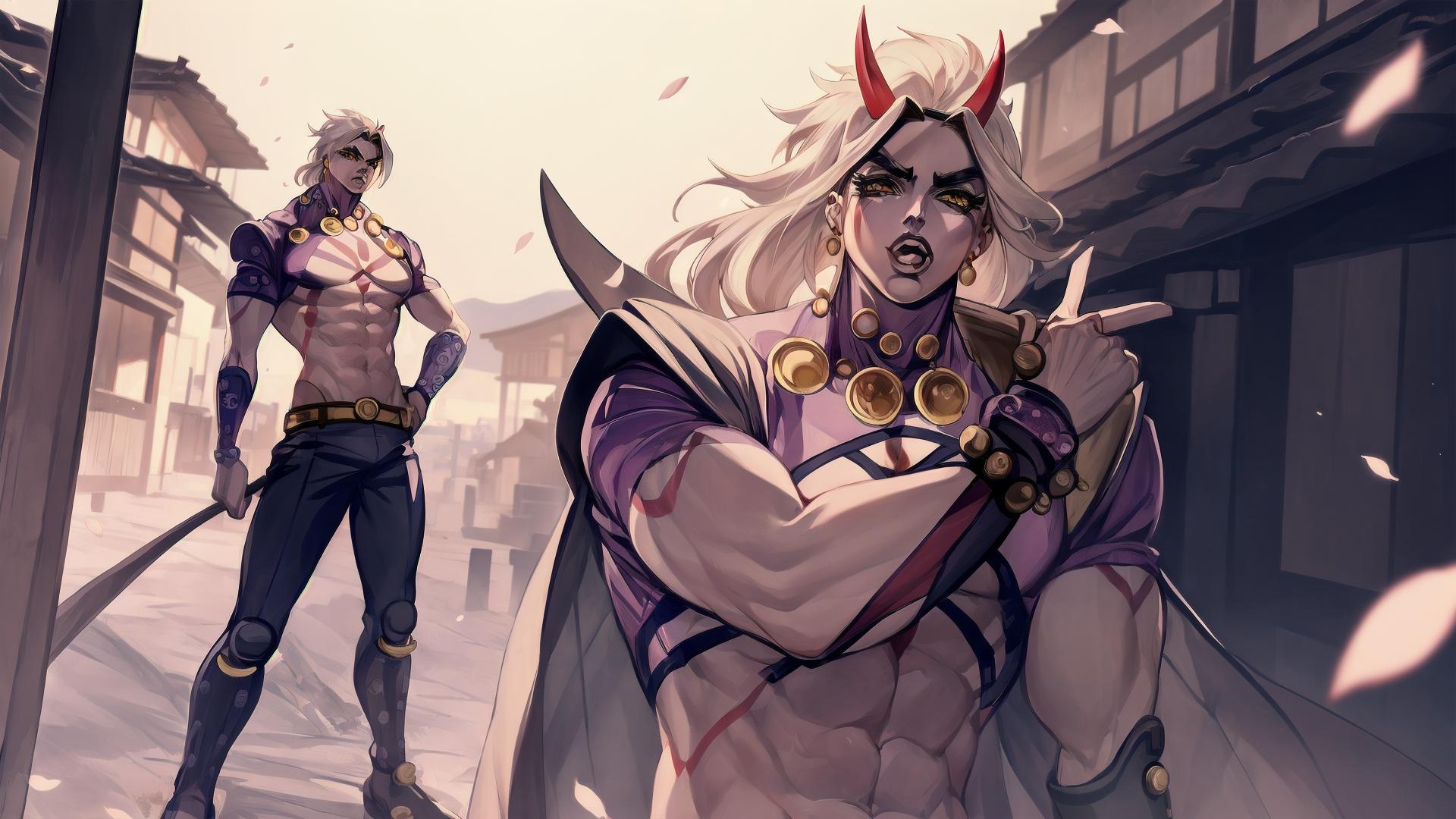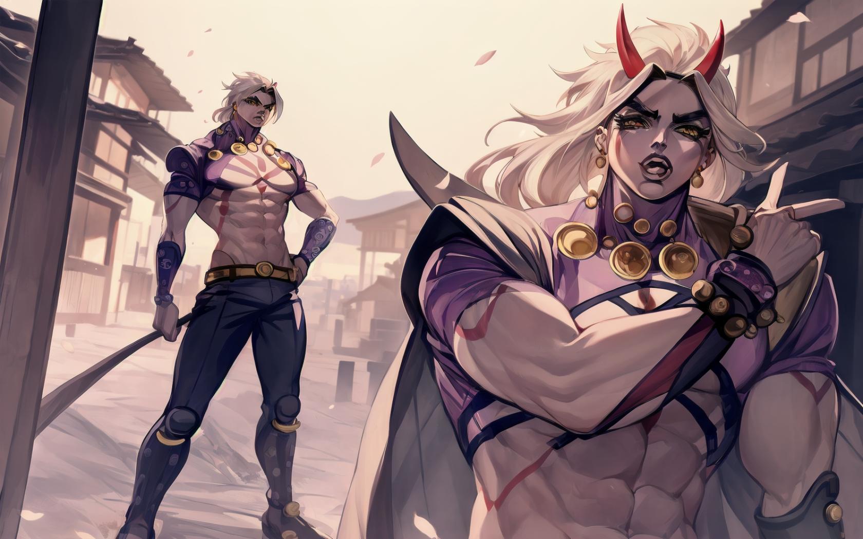 | Prompt | (highly detailed:1.5), (perfect artwork), best quality,,(8k), (4k),(Masterpiece), (Best Quality), extremely detailed, intricate, hyper detailed, (perfect face), illustration,soft lighting, clearly worked out detail, intricate, cinematic,(depth of field), <lora:itto:1>1boy, male focus,(muscular), (red horns),white hair, outdoors,japanese medieval town background, sakura, sakura blossoms, heroic pose, ((full body)), (jojo style:1.7), |