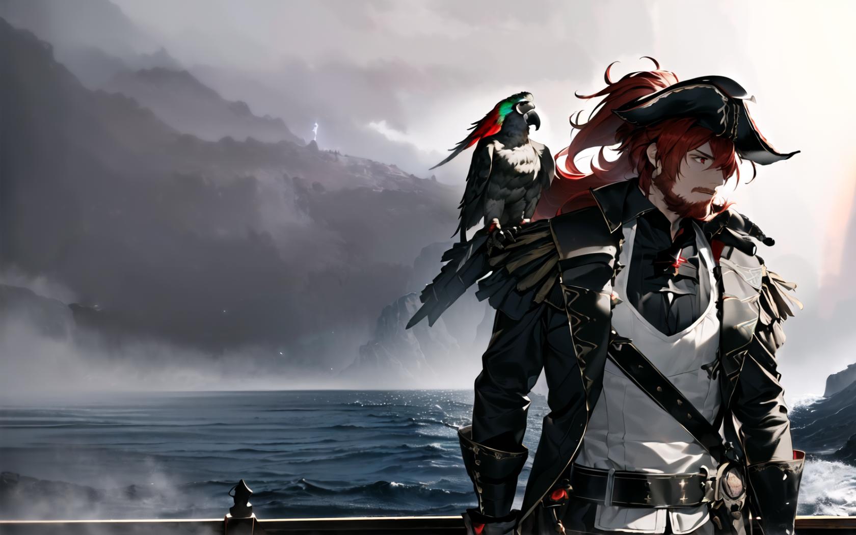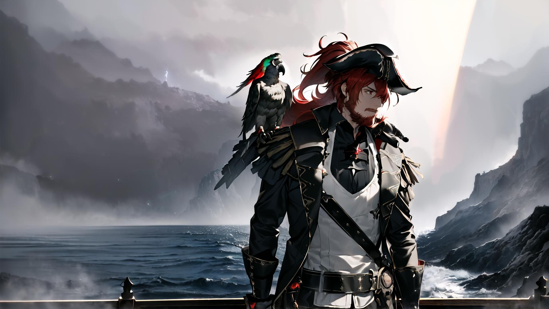 | Prompt | (highly detailed:1.5), (realistic:1.05),(digital art:1.7),,(romantic:1.4, heroic:1.7),(style of Peder Balke:1.8), (epic:1.5, perfect artwork), best quality,dynamic pose,sharp focus,(8k), (4k),(Masterpiece), (Best Quality), fantasy, extremely detailed, intricate, hyper detailed, (perfect face), illustration,soft lighting, Ultra detailed fantasy environment, clearly worked out detail, intricate, cinematic,(depth of field), ( dramatic lighting:1.6), <lora:Diluc_hardpruned:1>,diluc \(genshin impact\),, gloves, 1boy, bird, red eyes, red hair, male focus, black pants, belt, shirt, pants, vision (genshin impact), black gloves, long sleeves, hair between eyes, bangs, adjusting gloves, closed mouth, jacket, coat, solo, grey shirt, black coat, long hair, black shirt, adjusting clothes, collared shirt, black belt, open clothes, cropped legs, antenna hair, black jacket, two-tone gloves, belt buckle, (solo:1.9), ((muscular), (black military naval officer epaulettes:1.3), sunset, sea, (lightnings, raging sea background, waves, black clouds, mist, storm, tempest:1.4), (parrot on shoulder:1.6), (medieval pirate vessel:1.5), (black pirate hat:1.2), leather coat, (three days red beard:1.2), (standing front of the deck of a medieval pirate vessel:1.5), enigmatic, serious, looking at viewer, |