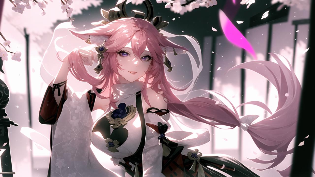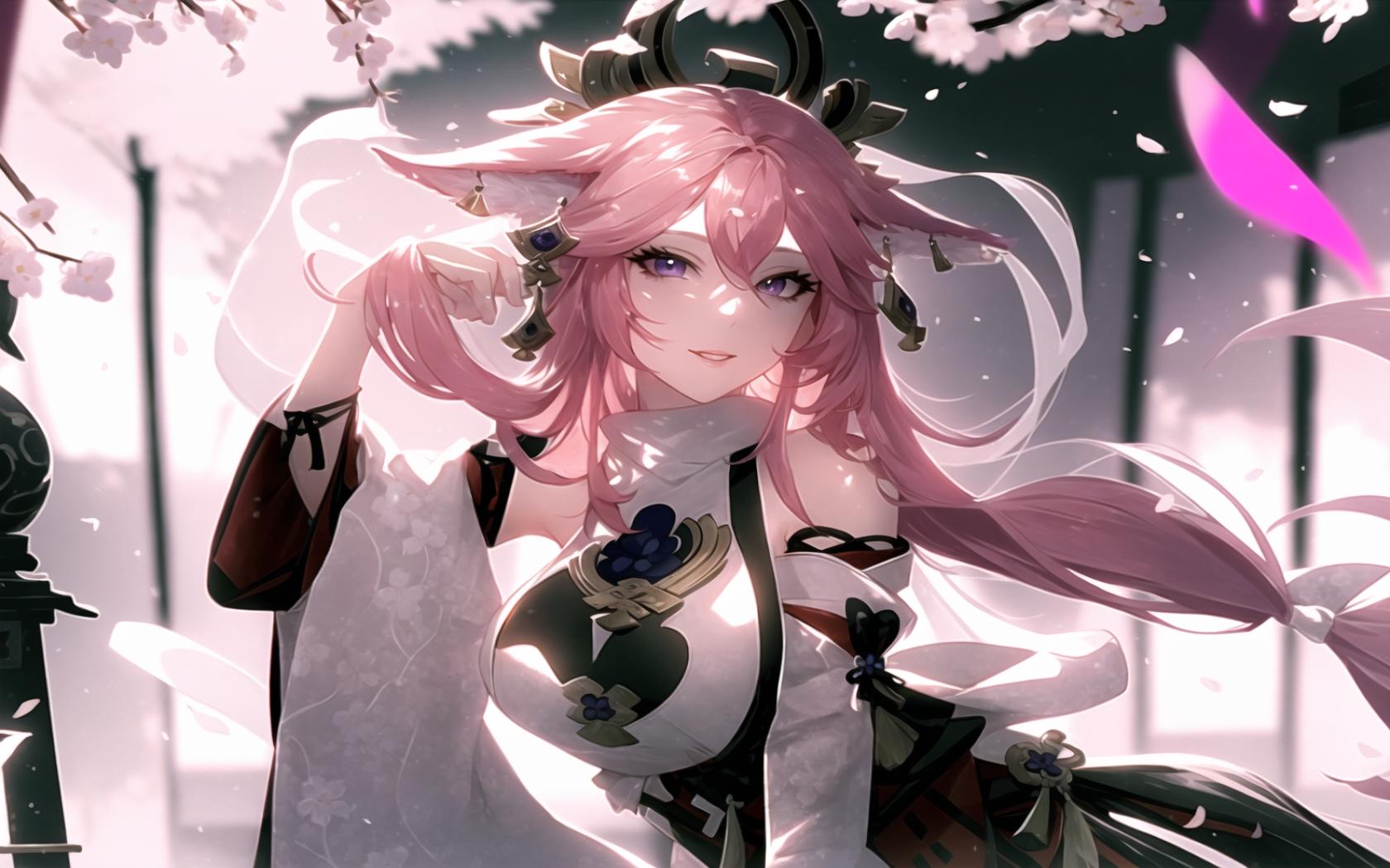 | Prompt | (highly detailed:1.5), (epic, romantic), <lora:beautiful-eyes:0.7>, (perfect artwork), best quality,sharp focus,(8k), (4k),(Masterpiece), (Best Quality), fantasy, extremely detailed, intricate, hyper detailed, (perfect face), illustration,soft lighting, Ultra detailed fantasy environment, clearly worked out detail, intricate, cinematic,(depth of field), ( dramatic lighting:1.2), <lora:yaemiko1:1>yaemikodef,1girl, solo,pink hair in the wind,large breasts, fox ears,((pink fluffy fox tail)), standing, bare legs,hand on chest, (medieval japanese temple background), sakura trees, sakura blossoms, smile, (sexy),, 1girl, animal ears, bangs, bare shoulders, blurry, blurry background, blurry foreground, branch, breasts, cherry blossoms, depth of field, falling petals, fox ears, hair between eyes, hair ornament, japanese clothes, leaves in wind, long hair, looking at viewer, low-tied long hair, petals, pink hair, purple eyes, smile, solo, torii, tree, very long hair, wind, yae sakura |