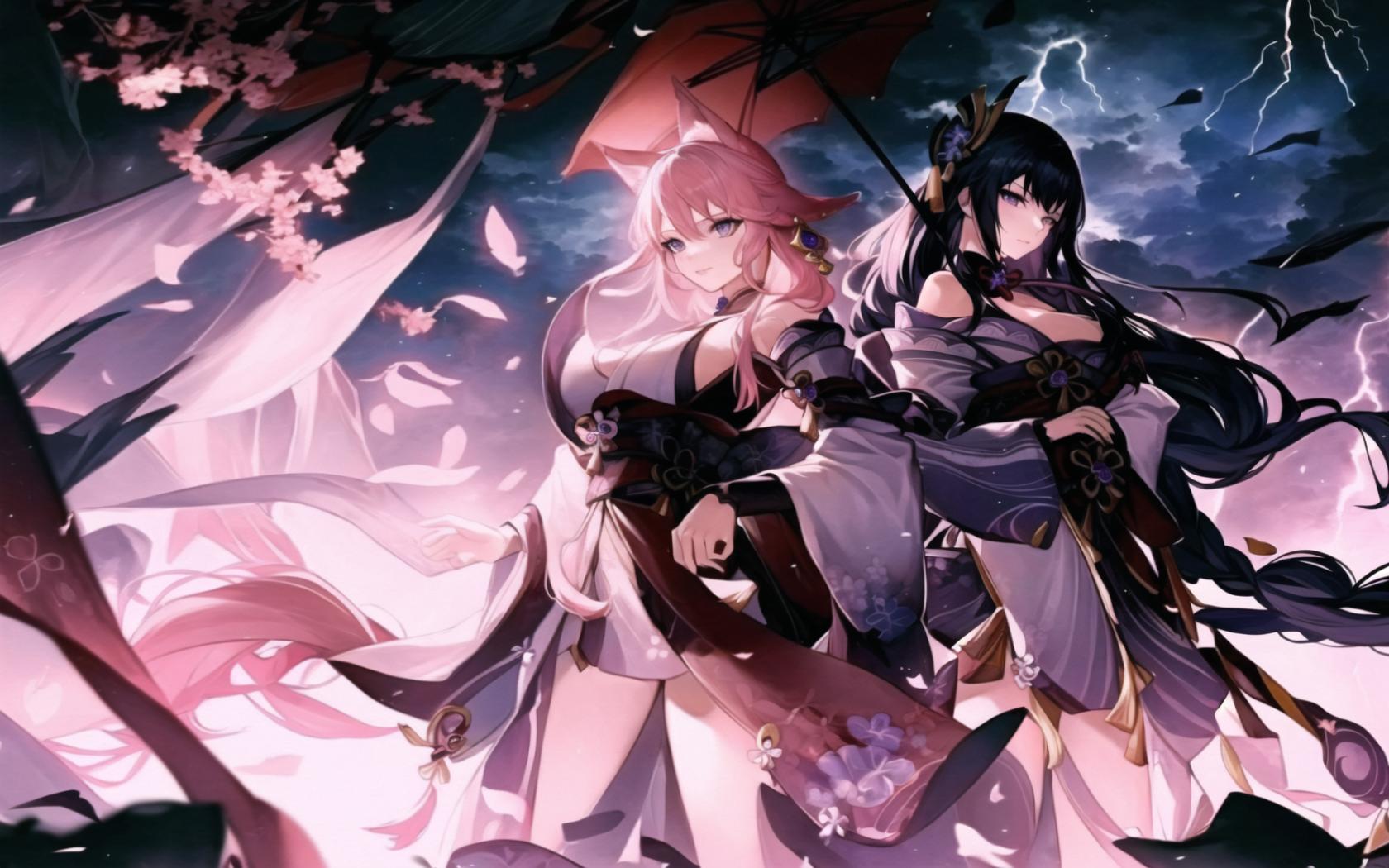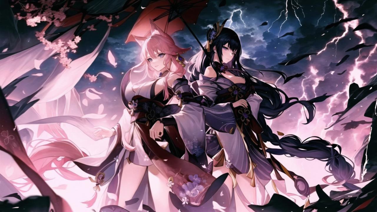 | Prompt | (highly detailed:1.5), (epic,realistic:1.3), (perfect artwork), best quality,sharp focus,(8k), (4k),(Masterpiece), (Best Quality), fantasy, extremely detailed, intricate, hyper detailed, (perfect face), illustration,soft lighting, clearly worked out detail, intricate, cinematic,(depth of field) ADDCOMM looking at viewer ((sakura, sakura blossoms)),standing upright,wind,galaxy background,moon, electricity, glowing purple aura ADDBASE <lora:yaemiko1:1>yaemikodef,1girl, solo,((pink hair, pink fox tail, pink fox ears), spring, day,happy, smile, (pink fox), japanese medieval temple background, grass ADDCOL <lora:raidenshogun1:1>raidenshogundef,1girl, solo,((purple hair)), (night,thunder, (lightnings), dark clouds, storm, maelstrom:1.1), ((wasted lands, islands background, apocalyptic art,dark atmosphere)), (purple thighhighs),serious, angry, holding umbrella, 2girls, animal ears, bangs, bare shoulders, black hair, braid, branch, breasts, cherry blossoms, cleavage, hair ornament, holding umbrella, japanese clothes, kimono, large breasts, long hair, multiple girls, oil-paper umbrella, outdoors, petals, smile, tree, umbrella, very long hair, wide sleeves |