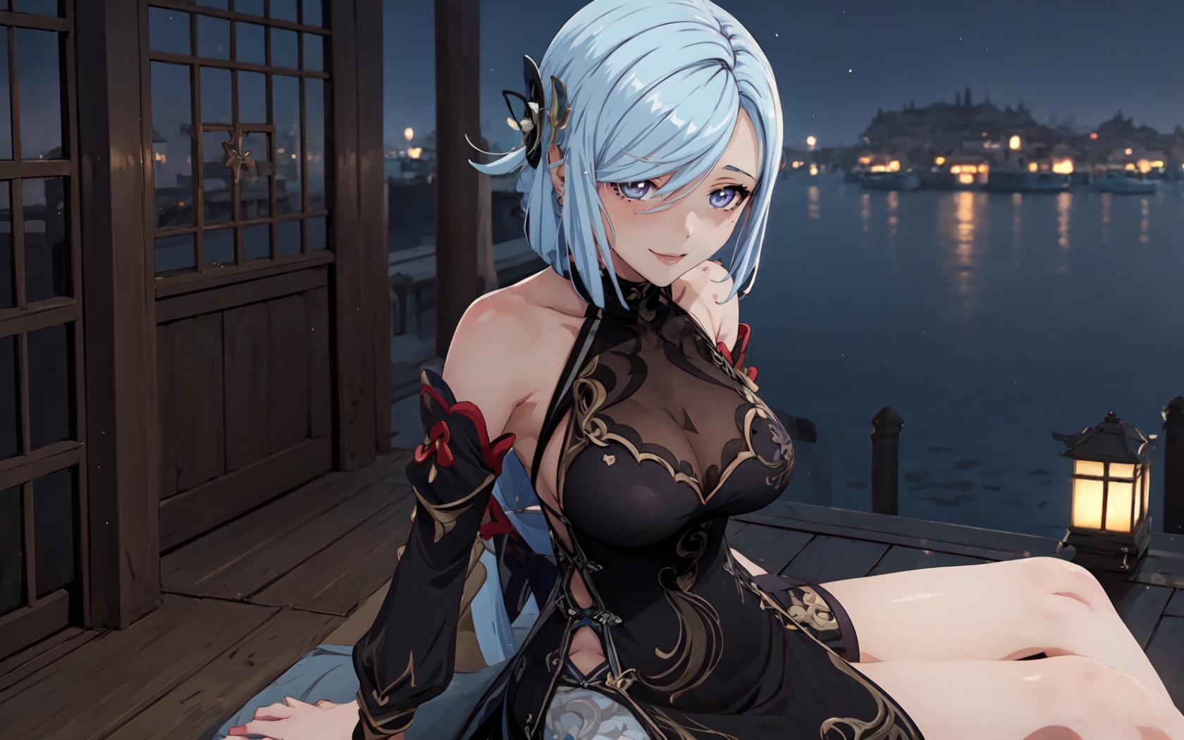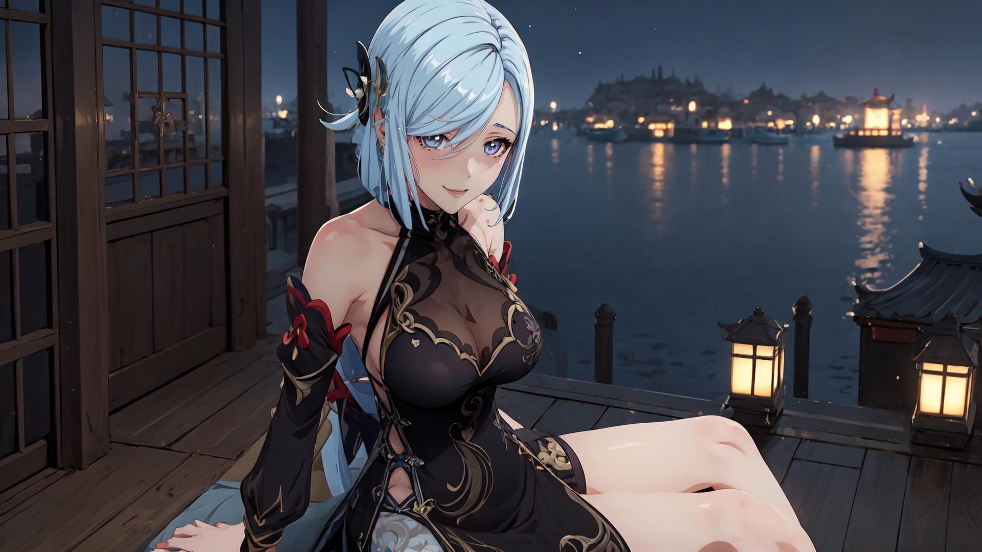 | Prompt | <lora:FrostflowerDewv3:0.8> shenhe \(genshin impact\), hair ornament,detached sleeves, chinese clothes, bare shoulders, china dress, black dress, jewelry, large breasts, cleavage,
