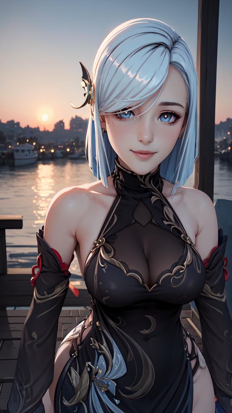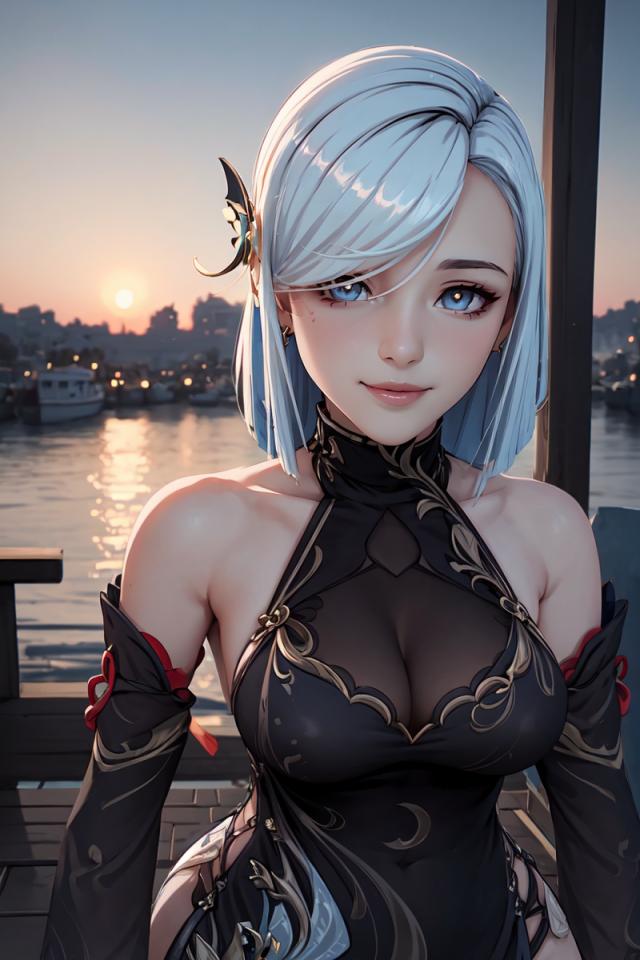 | Prompt | <lora:FrostflowerDewv3:0.9> shenhe \(genshin impact\), hair ornament,detached sleeves, chinese clothes, bare shoulders, china dress, black dress, jewelry, large breasts, cleavage,