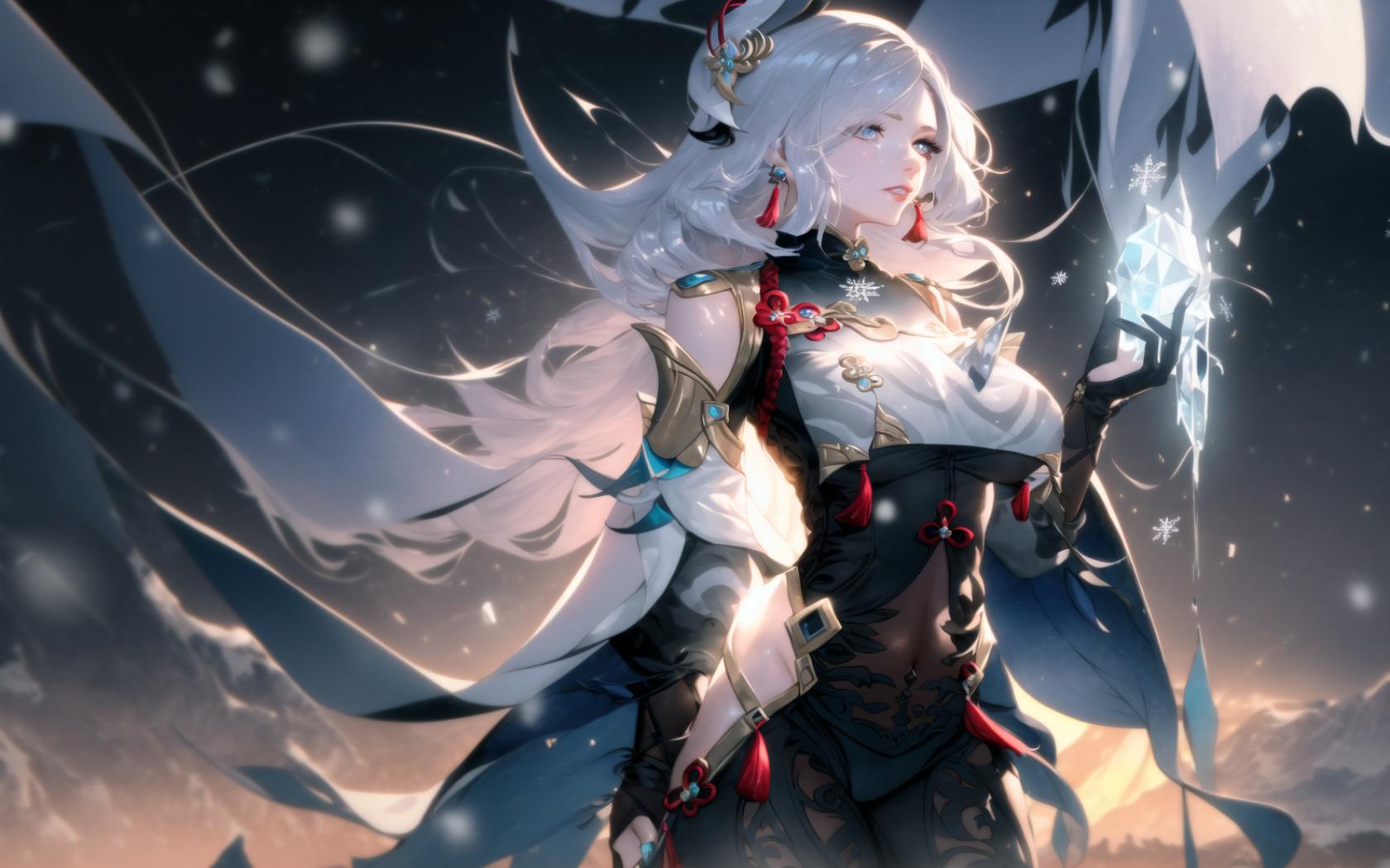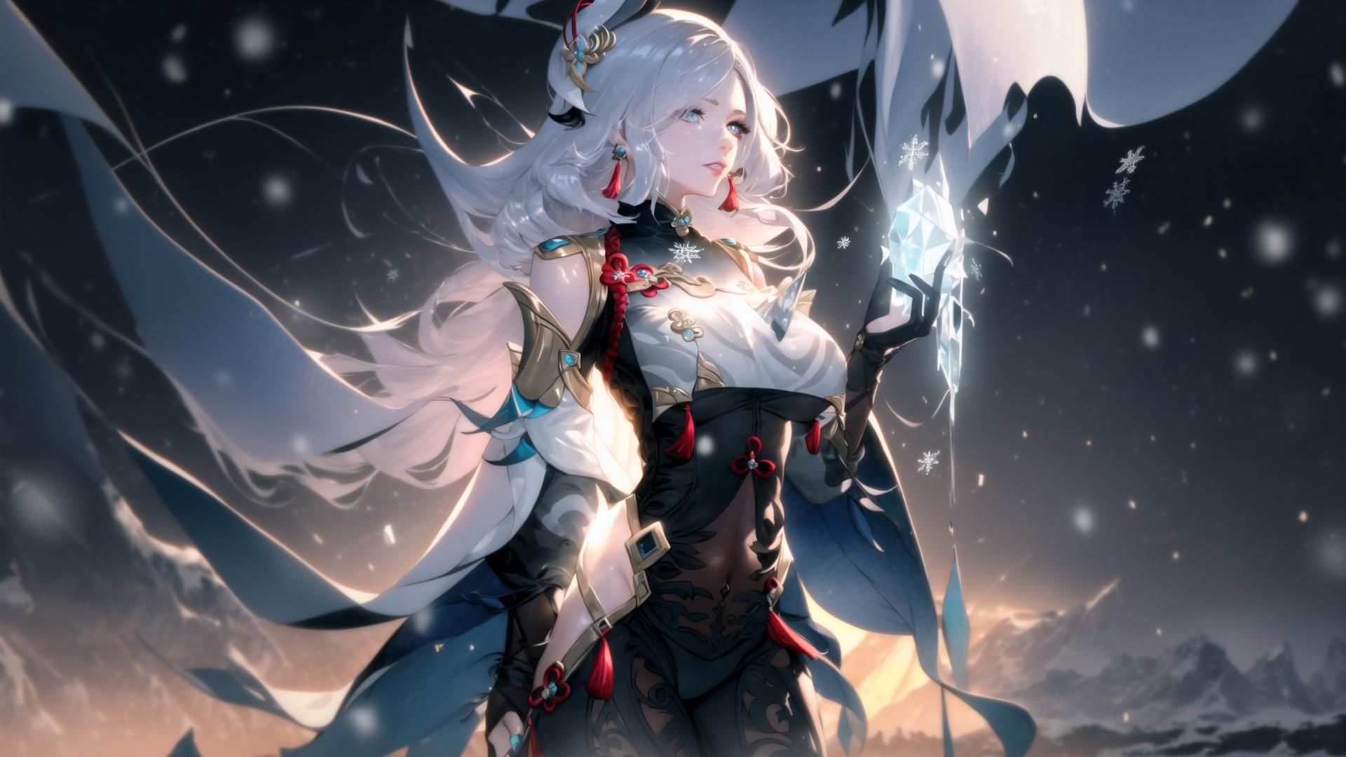| Prompt | (epic, heroic, dramatic1.4),(highly detailed:1.5), (realistic:1.05),(romantic:1.2),octane render,(hyperrealistic:1.4),(skindentation:1.3), <lora:beautiful-eyes:0.7> (epic:1.1, perfect artwork), best quality,,(8k), (4k),(Masterpiece), (Best Quality), extremely detailed, intricate, hyper detailed, (perfect face), illustration,soft lighting, clearly worked out detail, intricate, cinematic,(depth of field), (dramatic lighting:1.3), <lora:shenhe2:1>shenhedef,large breast, long white hair in the wind, white cape in the wind, (holding ice orb,night, aurora borealis, snow, snowflakes), (((snowy mountains,galaxy background))), (sad, sexy), looking at viewer, |