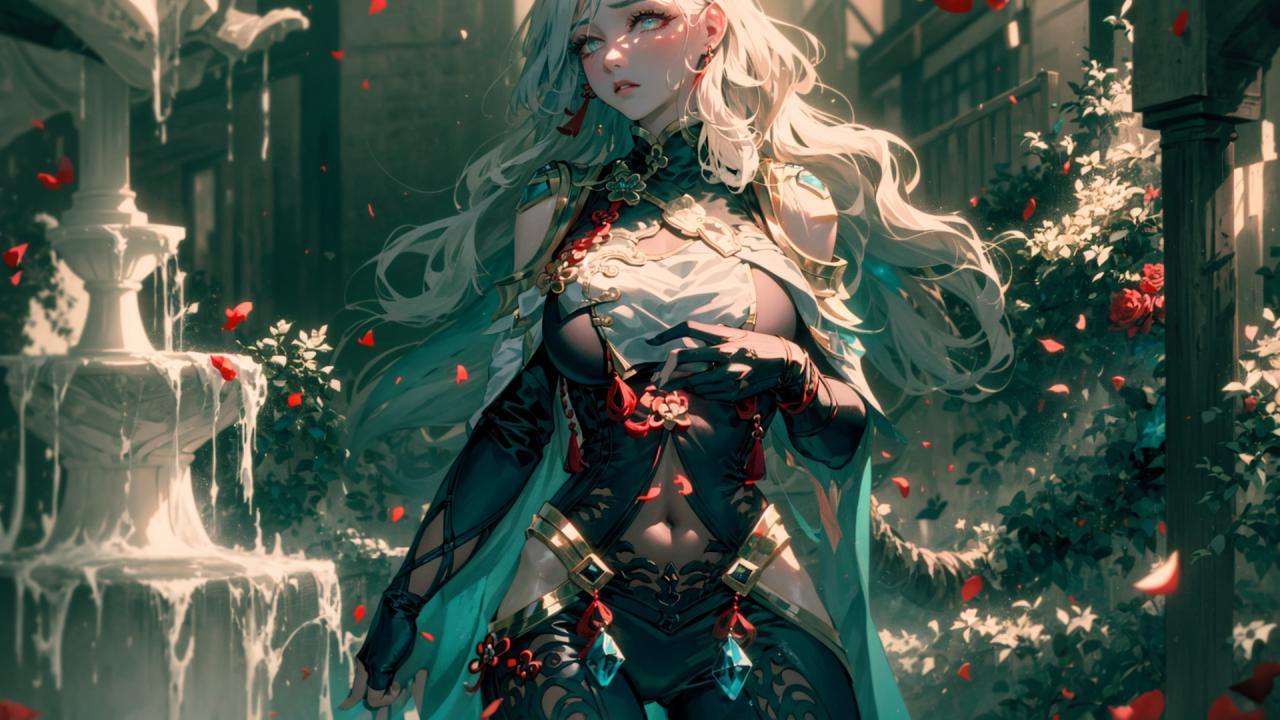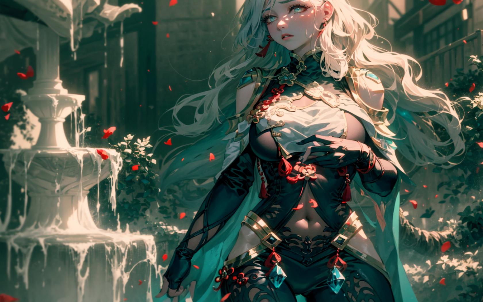 | Prompt | (epic, heroic, dramatic1.4),(highly detailed:1.5), (realistic:1.35),(romantic:1.2),octane render,(hyperrealistic:1.4),(skindentation:1.3), <lora:beautiful-eyes:0.7> (epic:1.1, perfect artwork), best quality,,(8k), (4k),(Masterpiece), (Best Quality), extremely detailed, intricate, hyper detailed, (perfect face), illustration,soft lighting, clearly worked out detail, intricate, cinematic,(depth of field), (dramatic lighting:1.3), <lora:shenhe2:1>shenhedef,large breast,white hair, garden, holding a red rose, white flowers, fountain,spring, sun, sunrays, medieval japanese temple background, (sad), |