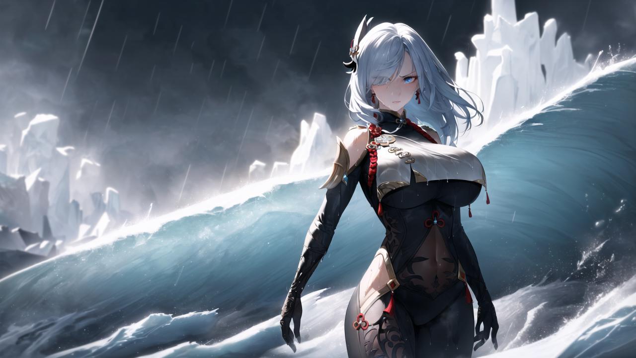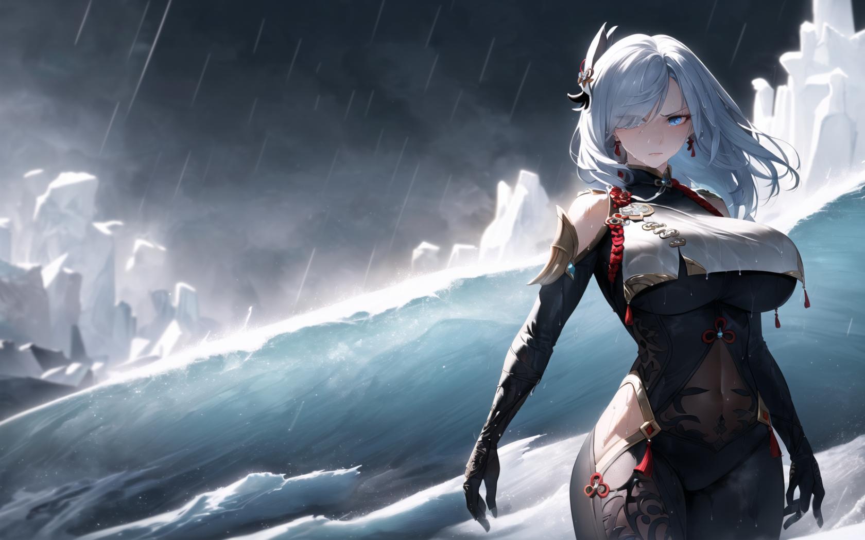 | Prompt | (dark fantasy art:1.2),(epic, heroic, dramatic lighting:1.7),(highly detailed:1.5),(romantic:1.2), (perfect artwork), best quality,(8k), (4k),(Masterpiece), (Best Quality), extremely detailed, intricate, hyper detailed, illustration, clearly worked out detail, intricate, cinematic,(depth of field), <lora:shenhe2:1>shenhedef, long white hair in the wind,((medium breast)), ((powerful,ice,iceshards, snowflakes,wind,rain, end of the world, black clouds, dark atmosphere,lightnings)), (standing upright on the shore), (realistic gigantic frozen wave background:1.3), ((action pose,cowboy shot,wet)), angry, serious, focused, |