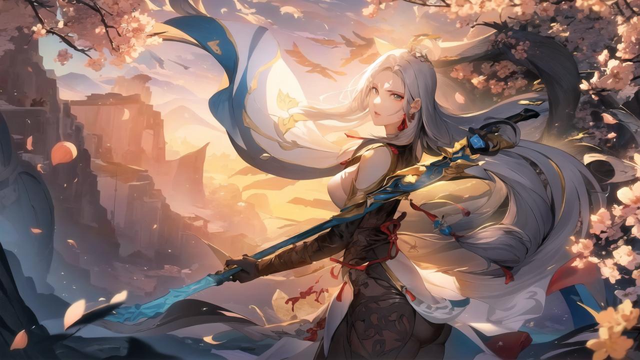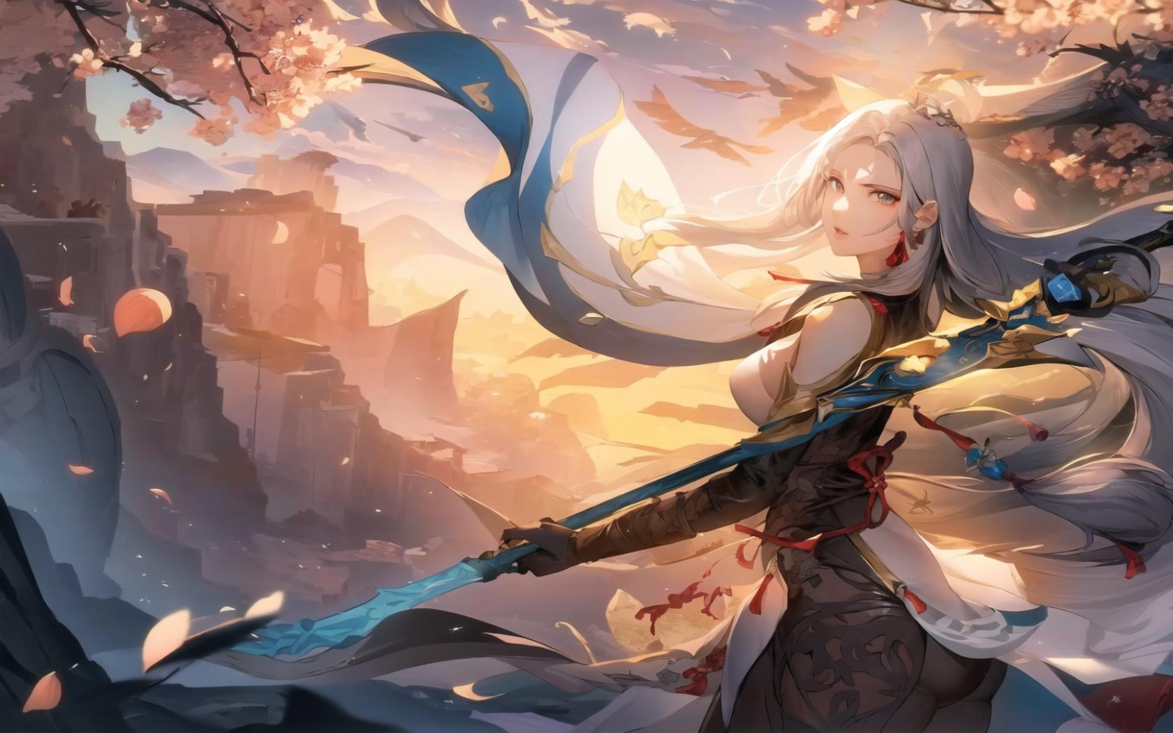 | Prompt | ( fantasy art:1.2),(epic, heroic, dramatic lighting:1.7),(highly detailed:1.5),(romantic:1.2), (perfect artwork), best quality,(8k), (4k),(Masterpiece), (Best Quality), extremely detailed, intricate, hyper detailed, illustration, clearly worked out detail, intricate, cinematic,(depth of field), <lora:shenhe2:1>shenhedef, long white hair in the wind,((medium breast)), wind, day, (((sunrise))), chinese forest background, spring, green, flowers,sakura blossoms, sakura trees, ((holding weapon)), (sexy), |