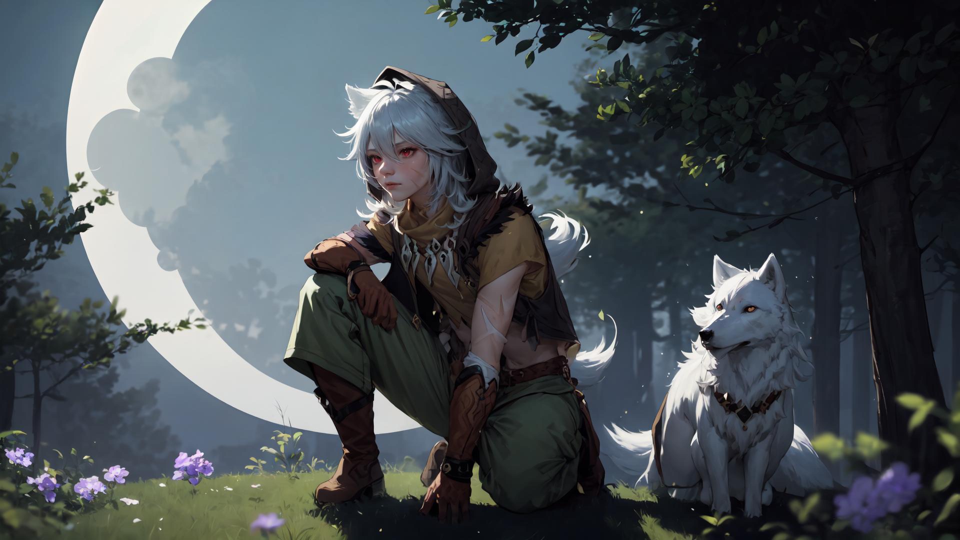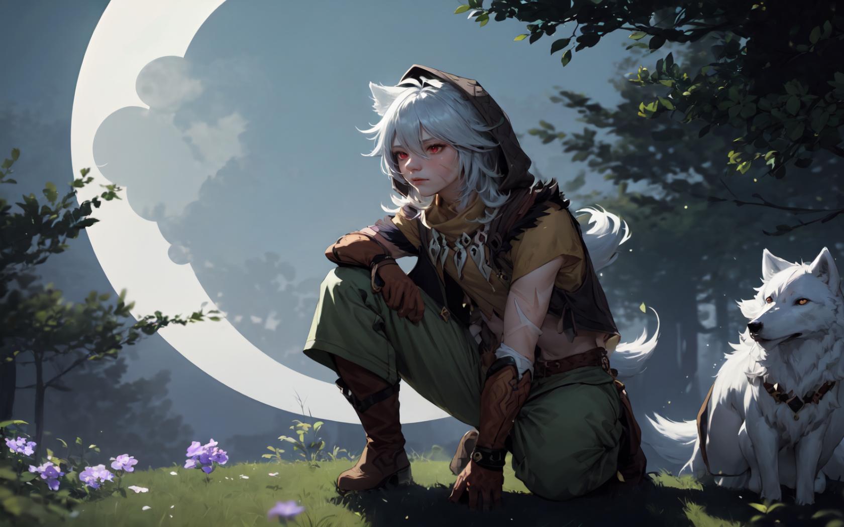 1boy, animal, animal ears, bangs, belt, boots, brown gloves, flower, gloves, grass, green pants, grey hair, hair between eyes, hood, hood up, jewelry, long hair, male focus, moon, nature, necklace, one knee, orange gloves , outdoors, pants, red eyes, scar, scar on face, tree, wolf