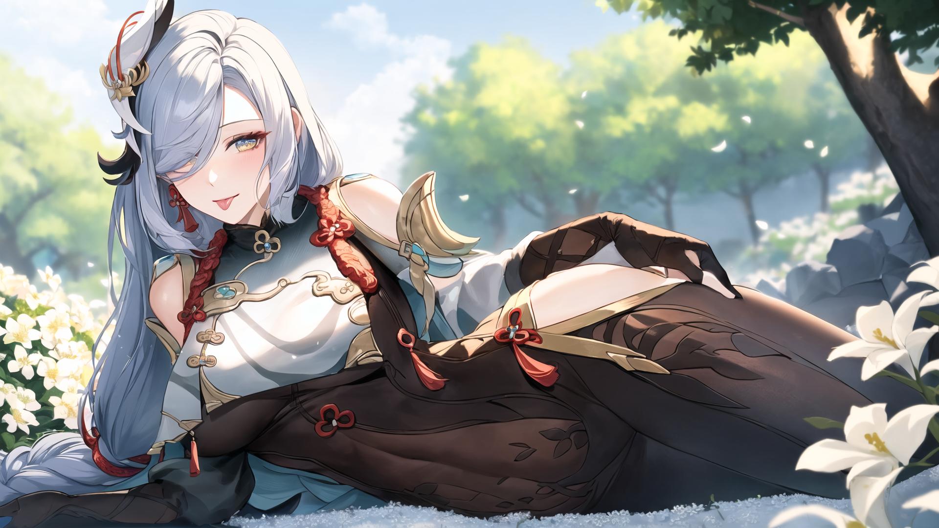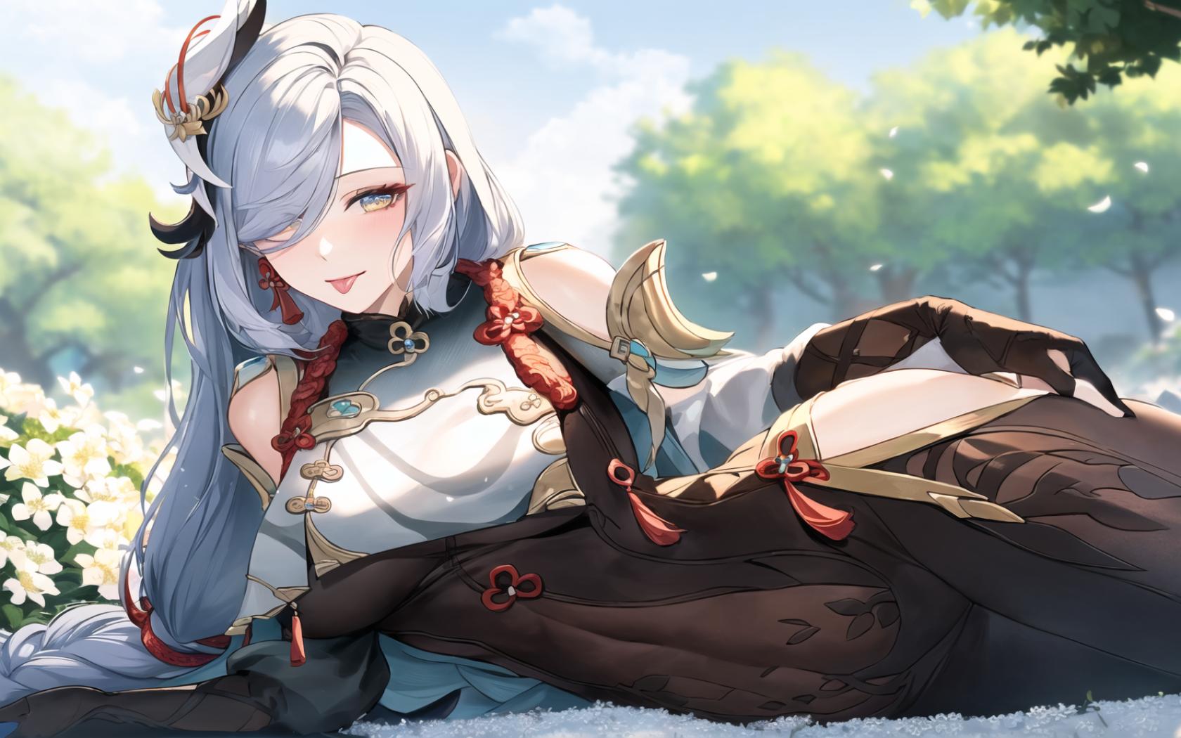 | Prompt | (dramatic1.2),(highly detailed:1.5), (realistic:1.05),(digital art:1.2),(romantic:1.2), (perfect artwork), best quality,(8k), (4k),(Masterpiece), (Best Quality), extremely detailed, intricate, hyper detailed, illustration, clearly worked out detail, intricate, cinematic,(depth of field), <lora:shenhe2:1.2>(shenhedef,1girl, solo), (single braid,long white hair), red roses, outdoors,(front of a japanese medieval temple), sakura blossoms,, day, lying on grass, (((((hidden behind bush of white flowers))))), spring, (cute,smile,looking at viewer,playful,side view, blush, tongue out,sexy) |